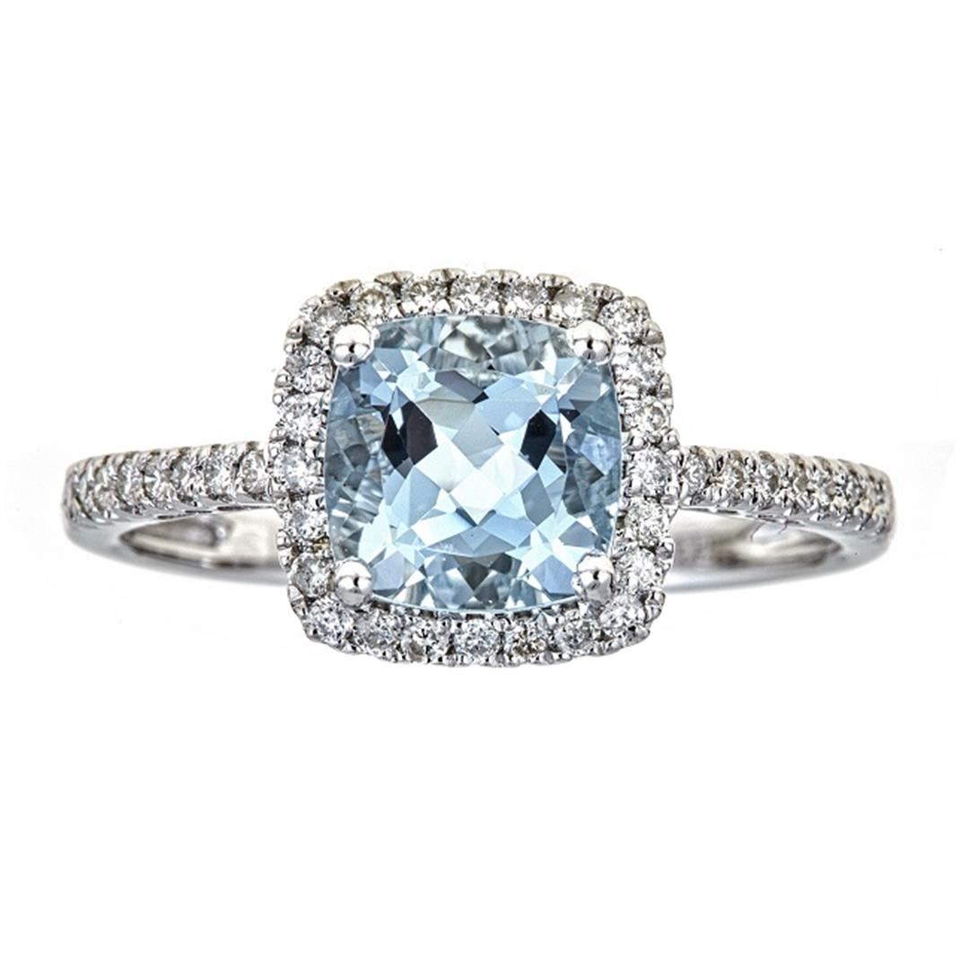 One Aquamarine and Diamond Ring featuring: 14KT White Gold with a total weight of 2.27 grams, Aquamarine with a total weight of 1.40ct, and 40 Round Cut Diamonds with a total weight of 0.24ctw.