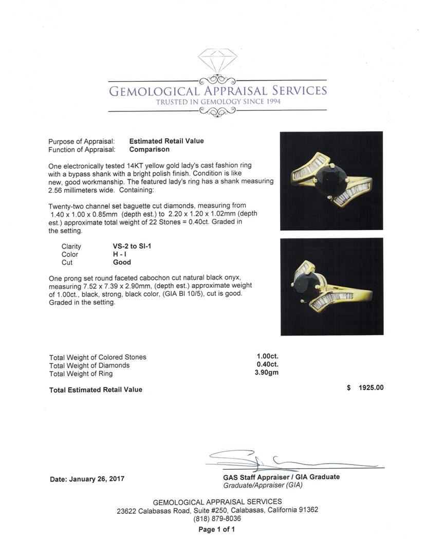 One electronically tested 14KT yellow gold lady's cast fashion ring with a bypass shank with a bright polish finish. The featured lady's ring has a shank measuring 2.56 millimeters wide. Condition is like new, good workmanship. Containing: Twenty-Two channel set baguette cut diamonds, measuring from 1.40 x 1.00 x 0.85mm (depth est.) to 2.20 x 1.20 x 1.02mm (depth est.) approximate total weight of 22 Stones = 0.40ct. Graded in the setting. Color H - I Clarity VS-2 to SI-1 Cut Good One prong set round faceted cabochon cut natural black onyx, measuring 7.52 x 7.39 x 2.90mm, (depth est.) approximate weight of 1.00ct., black, strong, black color, (GIA Bl 10/5), cut is good. Graded in the setting. Total Weight of Colored Stones 1.00ct.. Total Weight of Diamonds 0.40ct.. Total Weight of Ring 3.90gm. GAS Appraised at $1,925.00.