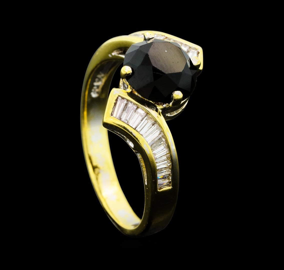 One electronically tested 14KT yellow gold lady's cast fashion ring with a bypass shank with a bright polish finish. The featured lady's ring has a shank measuring 2.56 millimeters wide. Condition is like new, good workmanship. Containing: Twenty-Two channel set baguette cut diamonds, measuring from 1.40 x 1.00 x 0.85mm (depth est.) to 2.20 x 1.20 x 1.02mm (depth est.) approximate total weight of 22 Stones = 0.40ct. Graded in the setting. Color H - I Clarity VS-2 to SI-1 Cut Good One prong set round faceted cabochon cut natural black onyx, measuring 7.52 x 7.39 x 2.90mm, (depth est.) approximate weight of 1.00ct., black, strong, black color, (GIA Bl 10/5), cut is good. Graded in the setting. Total Weight of Colored Stones 1.00ct.. Total Weight of Diamonds 0.40ct.. Total Weight of Ring 3.90gm. GAS Appraised at $1,925.00.