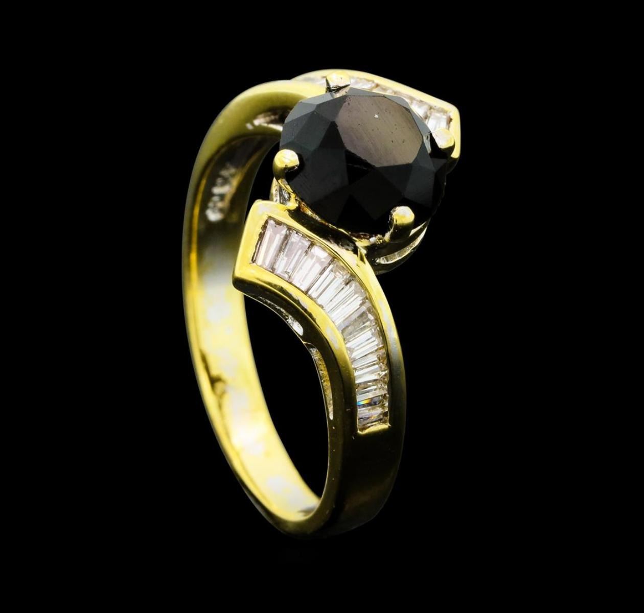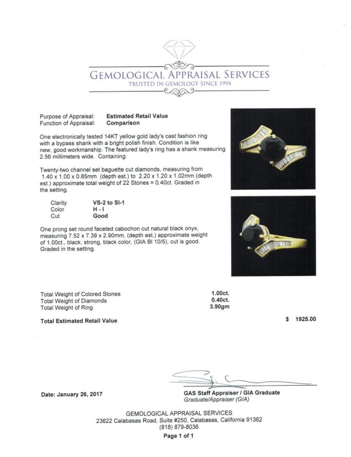 One electronically tested 14KT yellow gold lady's cast fashion ring with a bypass shank with a bright polish finish. The featured lady's ring has a shank measuring 2.56 millimeters wide. Condition is like new, good workmanship. Containing: Twenty-Two channel set baguette cut diamonds, measuring from 1.40 x 1.00 x 0.85mm (depth est.) to 2.20 x 1.20 x 1.02mm (depth est.) approximate total weight of 22 Stones = 0.40 ct. Graded in the setting. Color H - I Clarity VS-2 to SI-1 Cut Good One prong set round faceted cabochon cut natural black onyx, measuring 7.52 x 7.39 x 2.90mm, (depth est.) approximate weight of 1.00 ct., black, strong, black color, (GIA Bl 10/5), cut is good. Graded in the setting. Total Weight of Colored Stones 1.00 ct.. Total Weight of Diamonds 0.40 ct.. Total Weight of Ring 3.90gm. GAS Appraised.