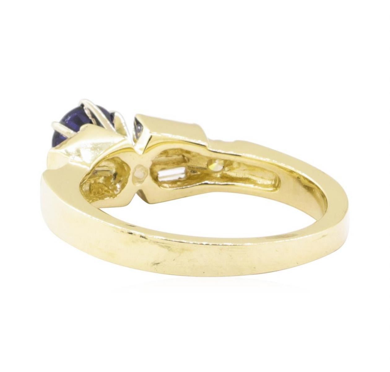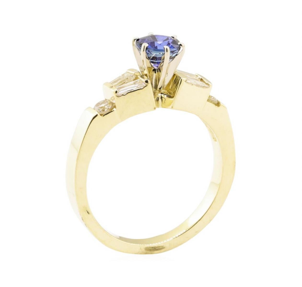 One electronically tested 14KT yellow gold lady's combination cast & assembled fashion ring with a split cathedral shank with a bright polish finish. The featured lady's ring has a shank measuring 2.40 millimeters wide. Identified with markings of '14K'. Condition is new, good workmanship. Containing: One prong set round modified mixed cut natural blue sapphire, measuring 5.50 - 5.45 x 3.60 mm, (depth est.) approximate weight of 0.92ct., clarity is eye clean, medium dark, moderately strong, violetish blue color, (GIA vB 6/4), cut is good. Transmitting light with no distortion, transparent. Colored gemstones are presumed to have been subjected to commonly used enhancement processes. Graded in the setting. Four channel set baguette cut diamonds, measuring from 3.50 x 1.70 x 1.45mm (depth est.) to 3.60 x 1.80 x 1.53mm (depth est.) approximate total weight of 4 Stones = 0.34ct. Graded in the setting. Color H - I Clarity VS-2 to SI-1 Cut Very Good Two channel set round brilliant cut diamonds, measuring 2.65 - 2.60 x 1.63mm (depth est.) approximate total weight of 2 Stones = 0.14ct. Graded in the setting. Color I - J Clarity SI-1 to SI-2 Cut Good. Total Weight of Colored Stones 0.92ct.. Total Weight of Diamonds 0.48ct.. Total Weight of Ring 5.10gm GAS Appraised at $2840.00. GAS Appraised.