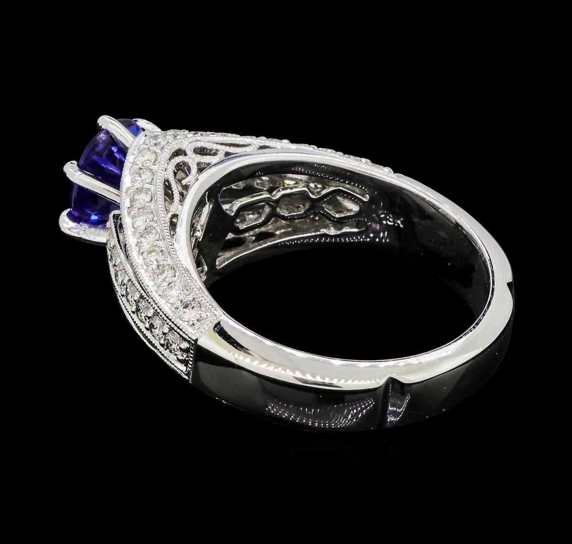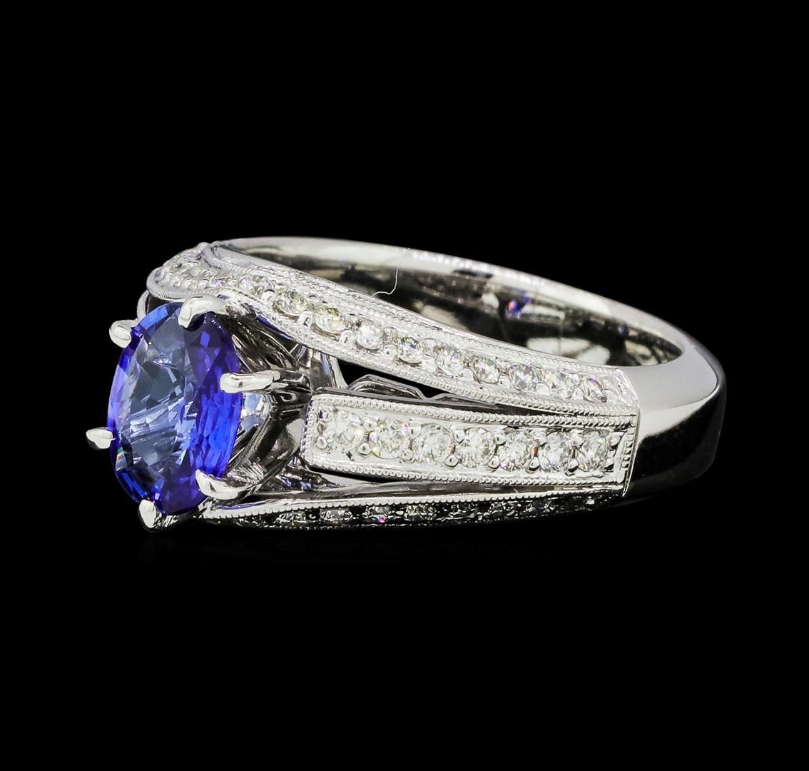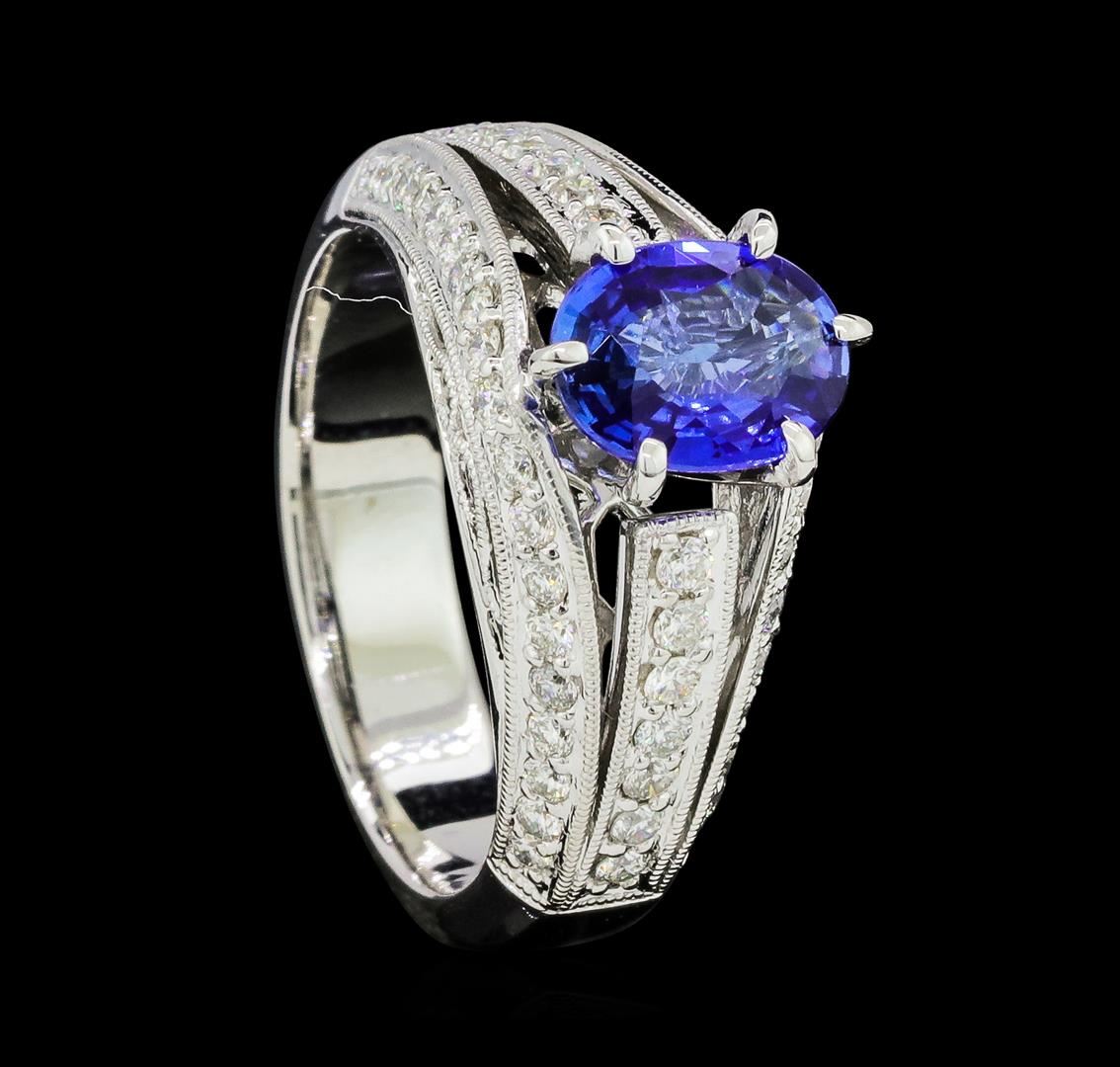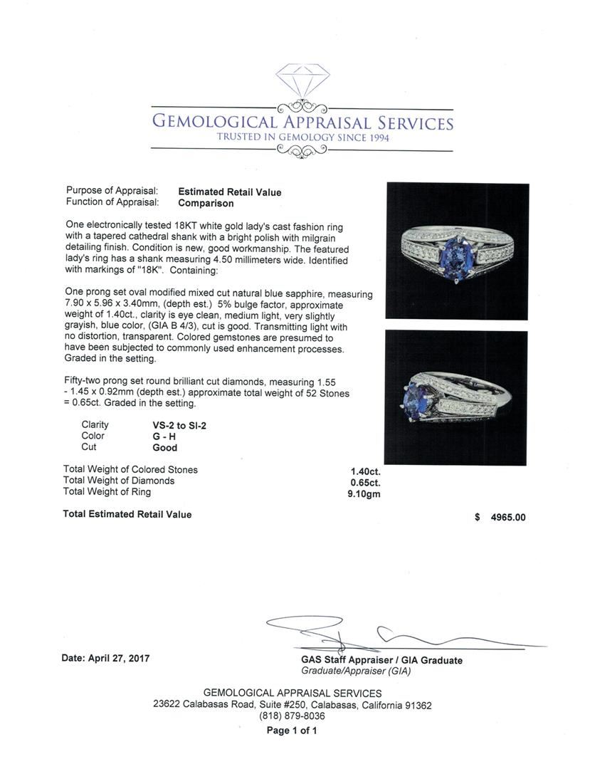 One electronically tested 18KT white gold lady's cast fashion ring with a tapered cathedral shank with a bright polish with milgrain detailing finish. The featured lady's ring has a shank measuring 4.50 millimeters wide. Identified with markings of '18K'. Condition is new, good workmanship. Containing: One prong set oval modified mixed cut natural blue sapphire, measuring 7.90 x 5.96 x 3.40mm, (depth est.) 5%. bulge factor, approximate weight of 1.40ct., clarity is eye clean, medium light, very slightly grayish, blue color, (GIA B 4/3), cut is good. Transmitting light with no distortion, transparent. Colored gemstones are presumed to have been subjected to commonly used enhancement processes. Graded in the setting. Fifty-Two prong set round brilliant cut diamonds, measuring 1.55 - 1.45 x 0.92mm (depth est.) approximate total weight of 52 Stones = 0.65ct. Graded in the setting. Color G - H Clarity VS-2 to SI-2 Cut Good. Total Weight of Colored Stones 1.40ct.. Total Weight of Diamonds 0.65ct.. Total Weight of Ring 9.10gm GAS Appraised at $4965.00. GAS Appraised at $4,965.00.