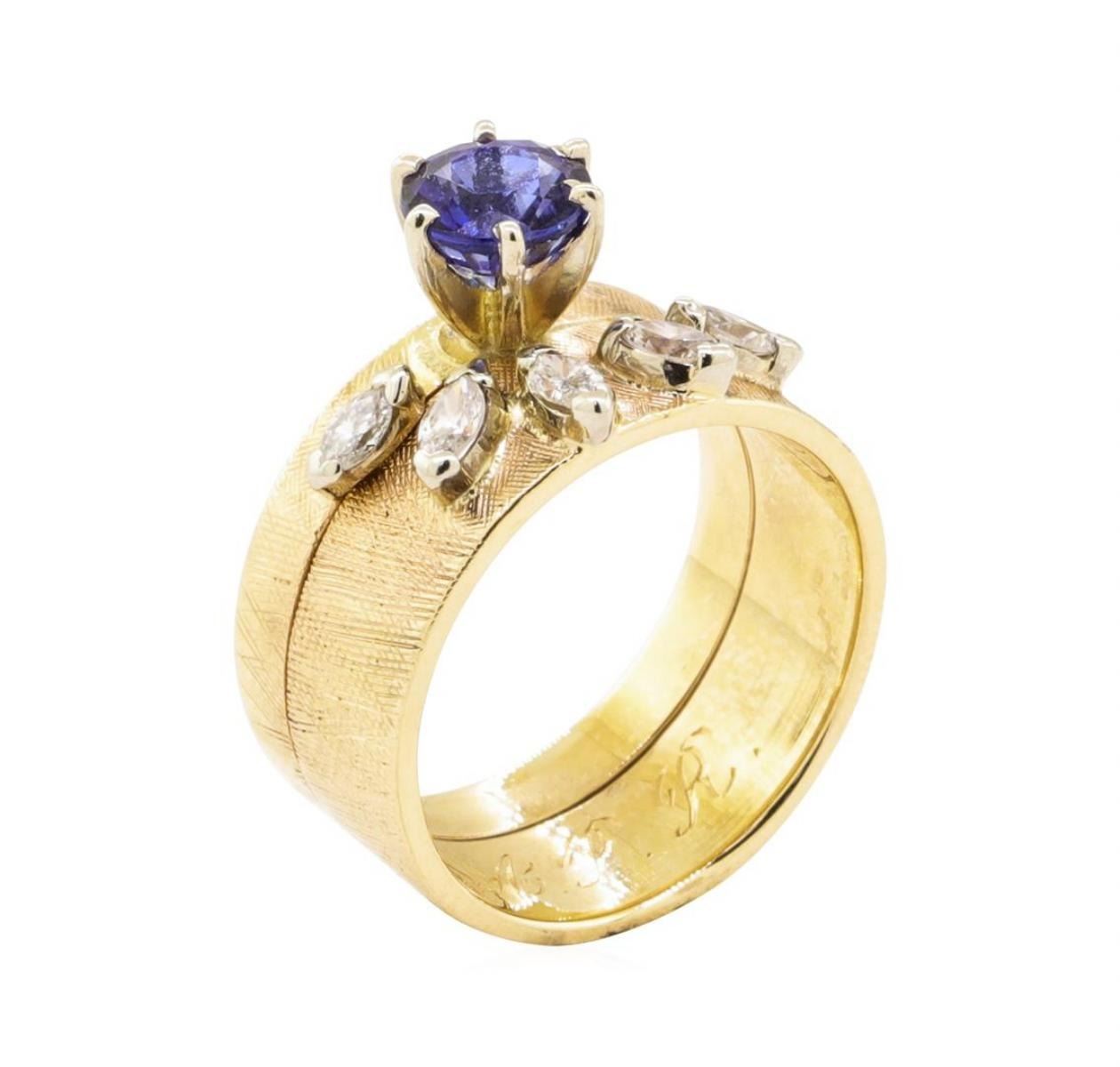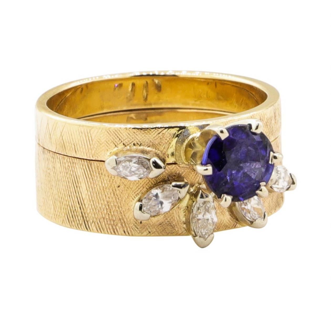 One band soldered to a ring featuring: 14KT yellow gold weighing 7.0 grams containing one sapphire weighing 1.10 ct and diamonds weighing 0.30 ctw.