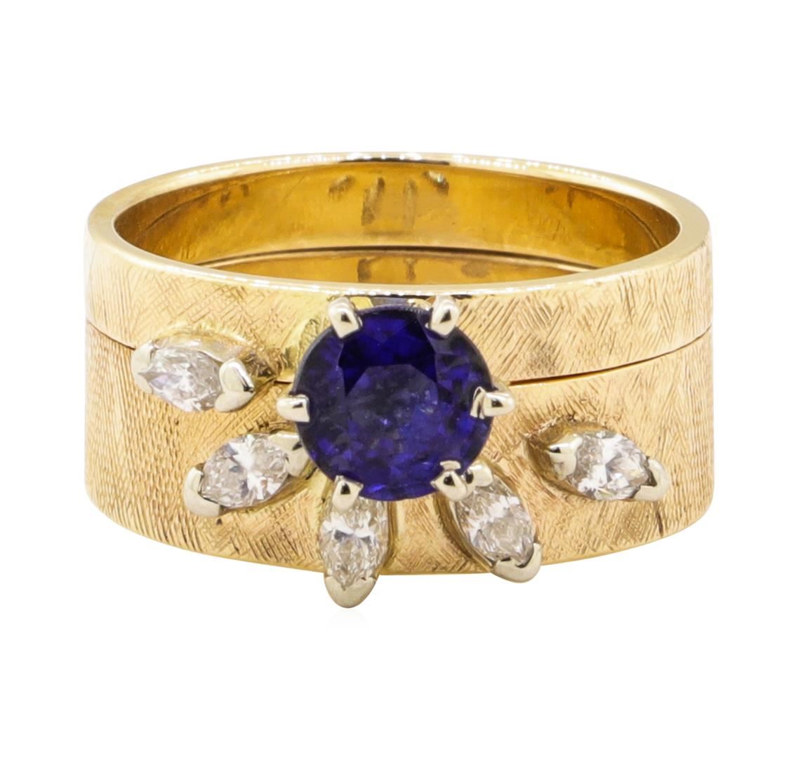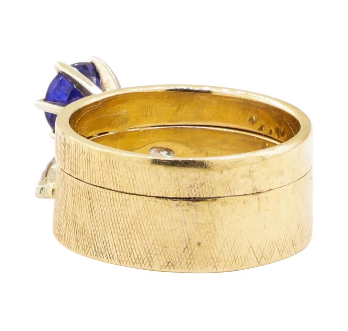 One band soldered to a ring featuring: 14KT yellow gold weighing 7.0 grams containing one sapphire weighing 1.10 ct and diamonds weighing 0.30 ctw.