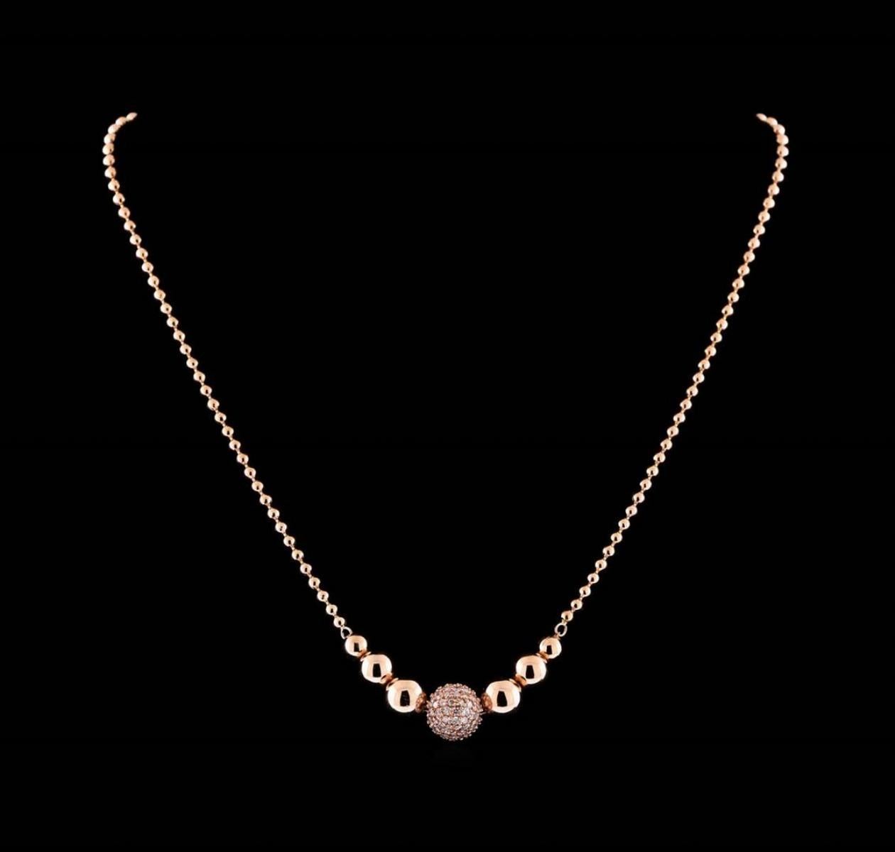 One electronically tested 14KT rose gold lady's combination cast & assembled fashion necklace with a lobster claw clasp with a bright polish finish. The featured lady's necklaces measures approximately 16.5 inches in length. Identified with markings of 'K14'. Condition is new, good workmanship. Containing: Thirty prong set round brilliant cut diamonds, measuring 1.75 - 1.65 x 1.02mm (depth est.) approximate total weight of 30 Stones = 0.54ct. Graded in the setting. Clarity SI-1 to SI-2. Color: H - I Cut Good Thirty prong set round brilliant cut diamonds, measuring 1.60 - 1.55 x 0.98mm (depth est.) approximate total weight of 30 Stones = 0.45ct. Graded in the setting. Clarity SI-1 to SI-2. Color: H - I Cut Good Forty prong set round brilliant cut diamonds, measuring 1.40 - 1.35 x 0.86mm (depth est.) approximate total weight of 40 Stones = 0.41ct. Graded in the setting. Clarity SI-1 to SI-2. Color: H - I Cut Good. Total Weight of Diamonds 1.40 ct.. Total Weight of Necklace 16.20gm. GAS Appraised.