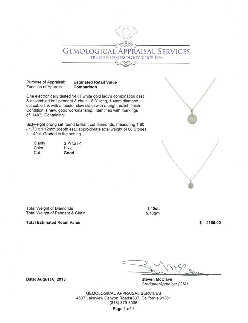 One electronically tested 14KT white gold lady's combination cast & assembled ball pendant & chain 18.0" long, 1.4mm diamond cut cable link with a lobster claw clasp with a bright polish finish. Identified with markings of "14K". Condition is new, good workmanship. Containing: Sixty-Eight prong set round brilliant cut diamonds, measuring 1.80 - 1.70 x 1.12mm (depth est.) approximate. Total Weight of 68 Stones = 1.40ct. Graded in the setting. Clarity: SI-1 to I-1. Color: H - Good. Total Weight of Diamonds 1.40ct. Total Weight of Pendant & Chain 5.70gm. GAS Appraised at $4,185.00.
