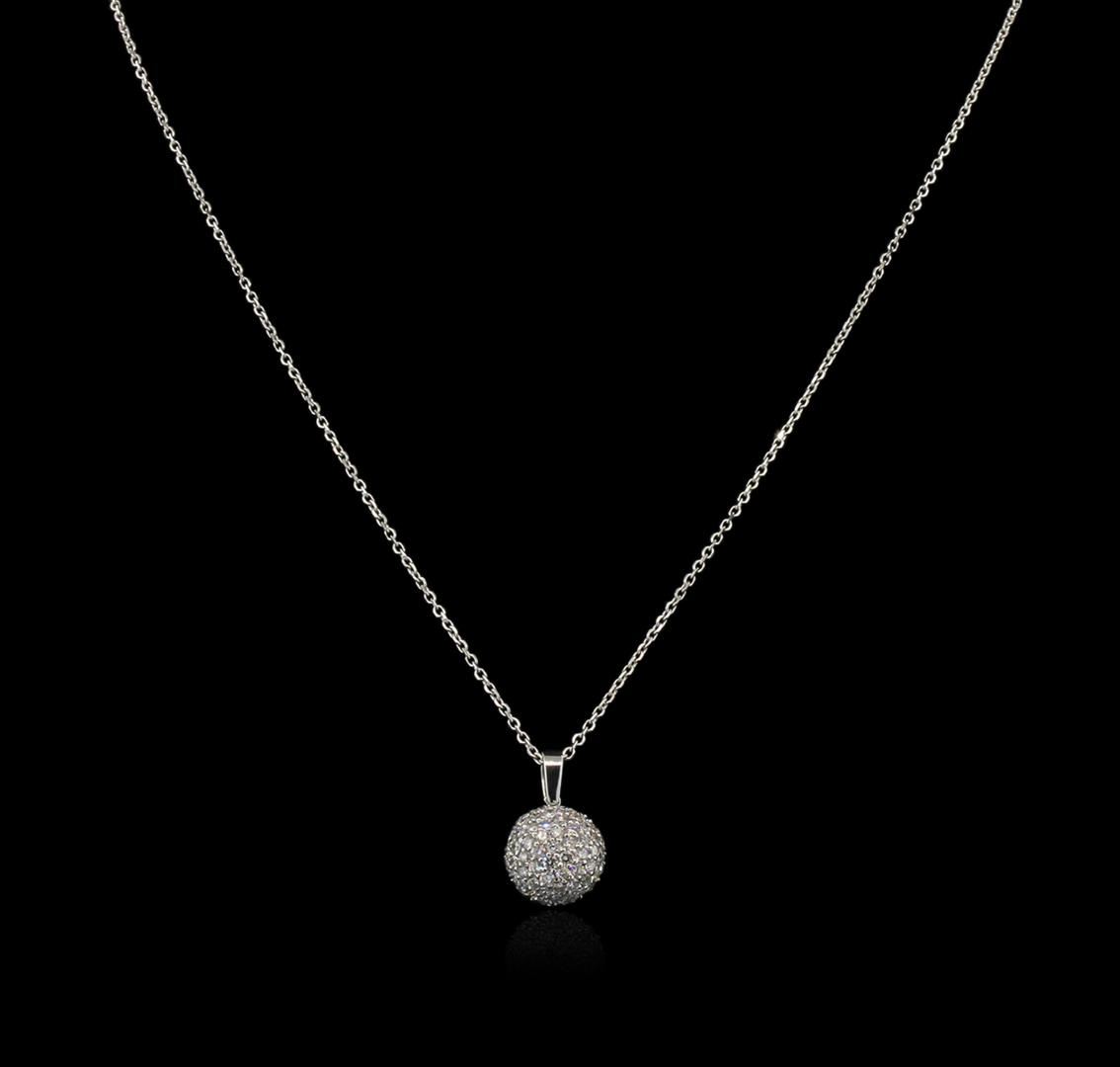 One electronically tested 14KT white gold lady's combination cast & assembled ball pendant & chain 18.0" long, 1.4mm diamond cut cable link with a lobster claw clasp with a bright polish finish. Identified with markings of "14K". Condition is new, good workmanship. Containing: Sixty-Eight prong set round brilliant cut diamonds, measuring 1.80 - 1.70 x 1.12mm (depth est.) approximate. Total Weight of 68 Stones = 1.40ct. Graded in the setting. Clarity: SI-1 to I-1. Color: H - Good. Total Weight of Diamonds 1.40ct. Total Weight of Pendant & Chain 5.70gm. GAS Appraised at $4,185.00.