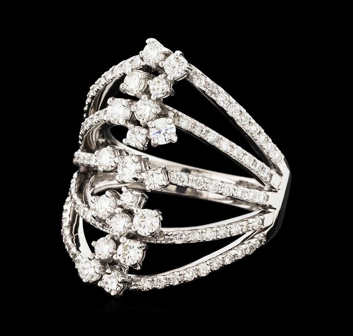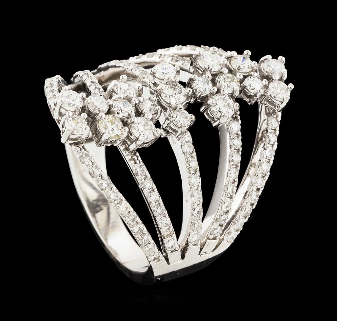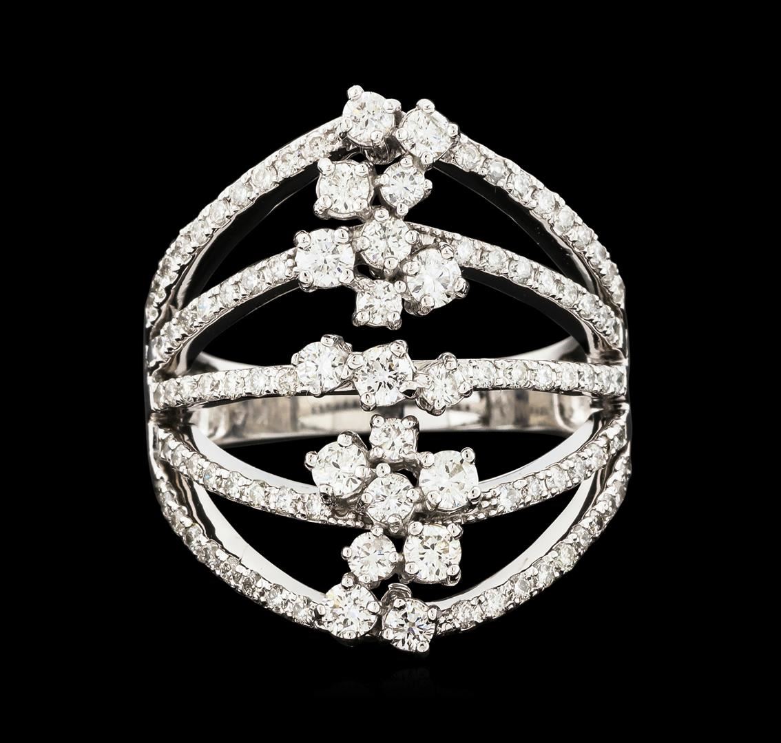 One electronically tested 14KT white gold lady's cast fashion ring with a five row wide band split shank with a bright polish finish. The featured lady's ring has a shank measuring 2.91 millimeters wide. Identified with markings of 'K14'. Condition is new, good workmanship. Containing: Fifteen prong set round brilliant cut diamonds, measuring 2.50 - 2.20 x 1.41mm (depth est.) approximate total weight of 15 Stones = 0.69ct. Graded in the setting. Clarity SI-1 to SI-2. Color: H - I Cut Good Four prong set round brilliant cut diamonds, measuring 1.90 - 1.85 x 1.17mm (depth est.) approximate total weight of 4 Stones = 0.10ct. Graded in the setting. Clarity SI-1 to I-1. Color: H - I Cut Good Eighty-Four prong set round brilliant cut diamonds, measuring 1.30 - 1.20 x 0.76mm (depth est.) approximate total weight of 84 Stones = 0.61ct. Graded in the setting. Clarity SI-1 to SI-3. Color: H - I Cut Good. Total Weight of Diamonds 1.40ct.. Total Weight of Ring 6.80gm. GAS Appraised at $4,990.00.