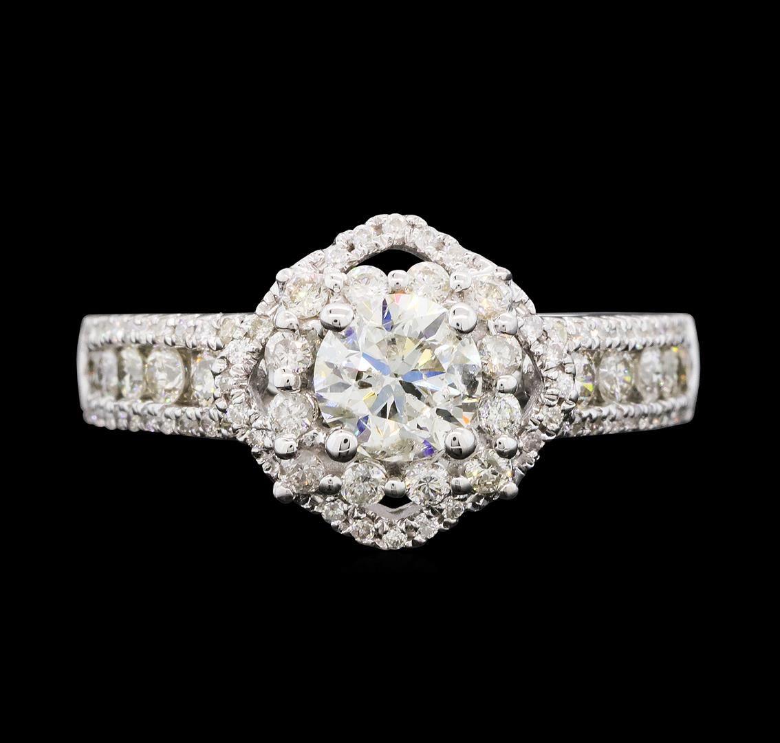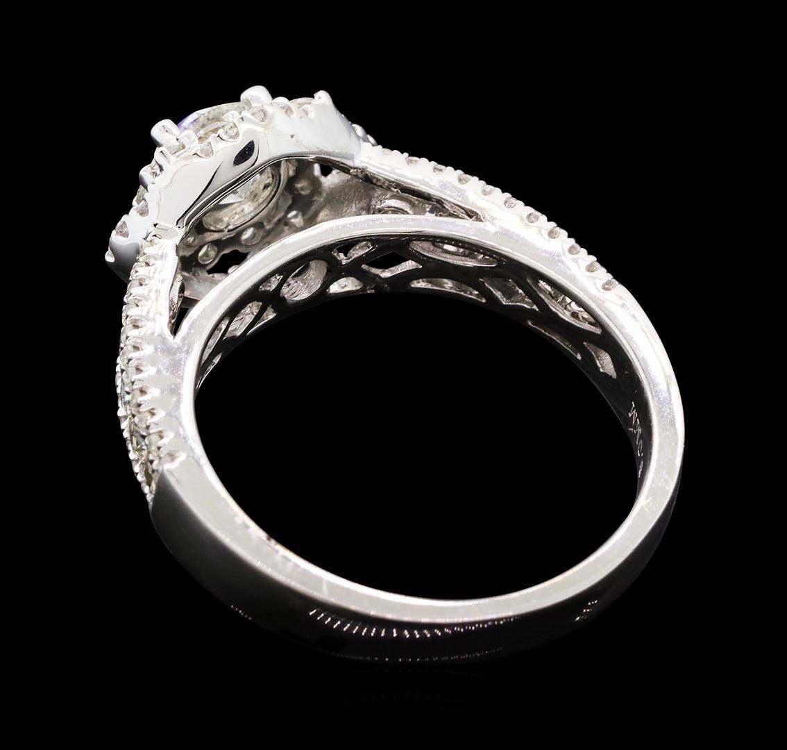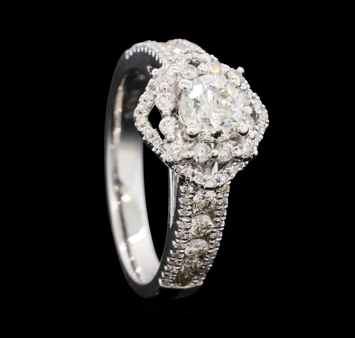 One electronically tested 14KT white gold lady's cast wedding ring with a cathedral shank with a halo with a bright polish finish. The featured lady's ring has a shank measuring 3.00 millimeters wide. Identified with markings of '14K'. Condition is new, good workmanship. Containing: One prong set round brilliant cut diamond, measuring 5.52 - 5.50 x 3.54mm (depth est.) , 5.00.%. GTCF approximate weight of 0.70ct. Graded in the setting. Color H Clarity I-1 Cut Very Good Ten channel set round brilliant cut diamonds, measuring 2.10 - 2.00 x 1.23mm (depth est.) approximate total weight of 10 Stones = 0.31ct. Graded in the setting. Color H - I Clarity SI-1 to I-1 Cut Good Twelve prong set round brilliant cut diamonds, measuring 1.70 - 1.60 x 1.02mm (depth est.) approximate total weight of 12 Stones = 0.20ct. Graded in the setting. Color H - I Clarity SI-1 to I-1 Cut Good Sixty-Four prong set round brilliant cut diamonds, measuring 1.00 - 0.90 x 0.57mm (depth est.) approximate total weight of 64 Stones = 0.19ct. Graded in the setting. Color H - I Clarity SI-1 to I-1 Cut Good. Total Weight of Diamonds 1.40ct.. Total Weight of Ring 5.10gm GAS Appraised at $8,230.00.