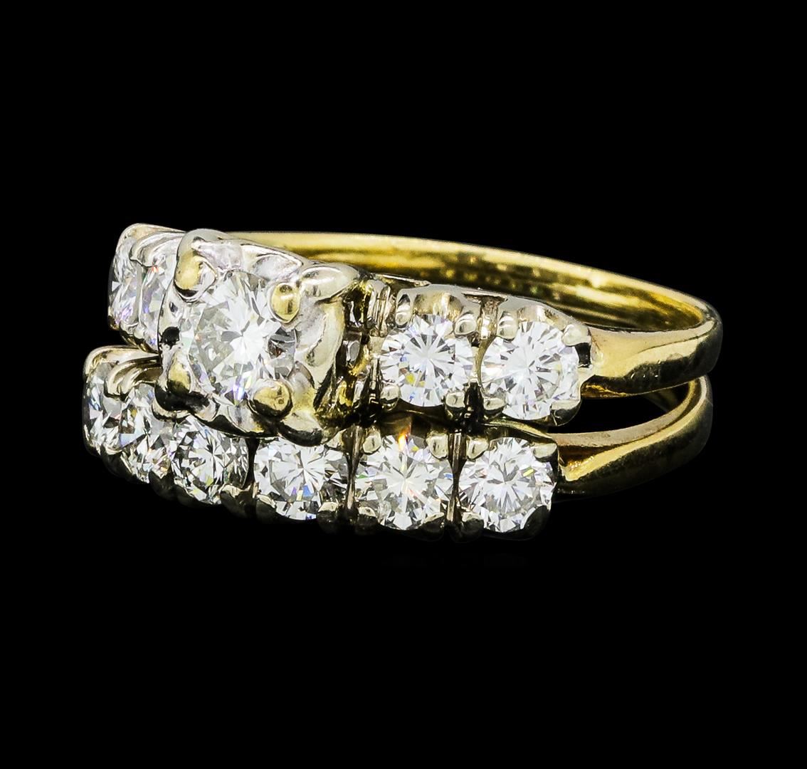 One set electronically tested 14KT yellow and white gold lady's cast wedding ring & wedding band with a bright polish finish. The featured lady's ring and band have a double shank measuring 3.80 millimeters wide. Condition is used, good workmanship. Containing: One prong set round brilliant cut diamond, measuring 4.30 - 4.20 x 2.36mm (depth est.) approximate weight of 0.26ct. Graded in the setting. Color I Clarity SI-2 Cut Good Ten prong set round brilliant cut diamonds, measuring 3.30 - 3.10 x 1.92mm (depth est.) approximate total weight of 10 Stones = 1.14ct. Graded in the setting. Color H - I Clarity VS-2 to SI-1 Cut Good. Total Weight of Diamonds 1.40ct.. Total Weight of Ring & Wedding Band 5.50gm GAS Appraised at $3765.00. GAS Appraised at $3,765.00.