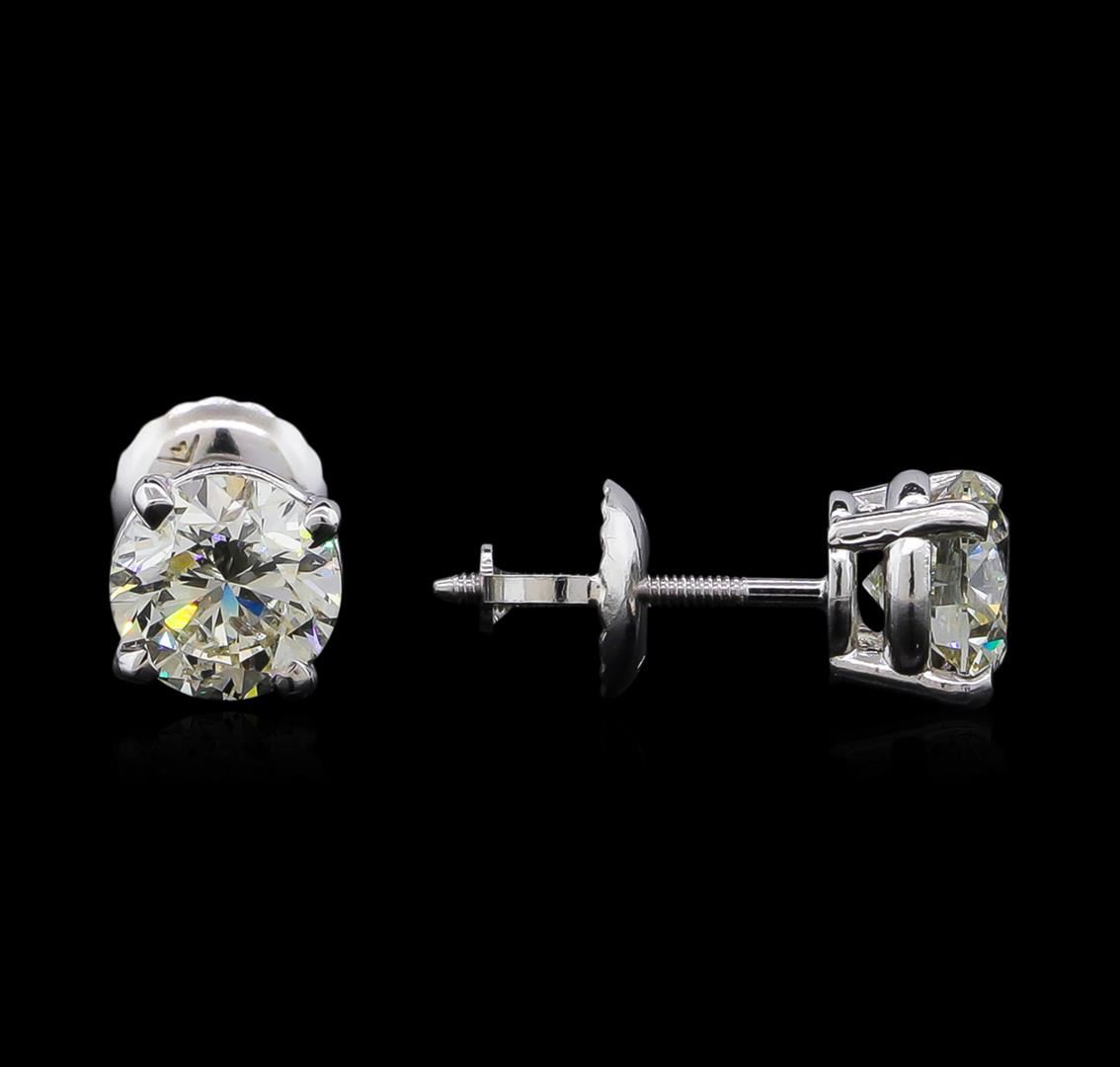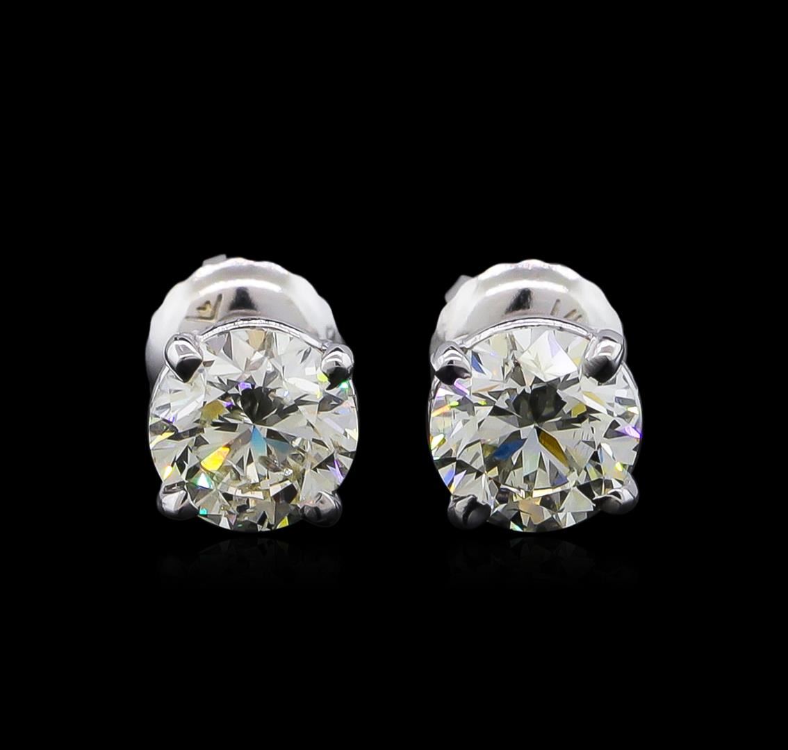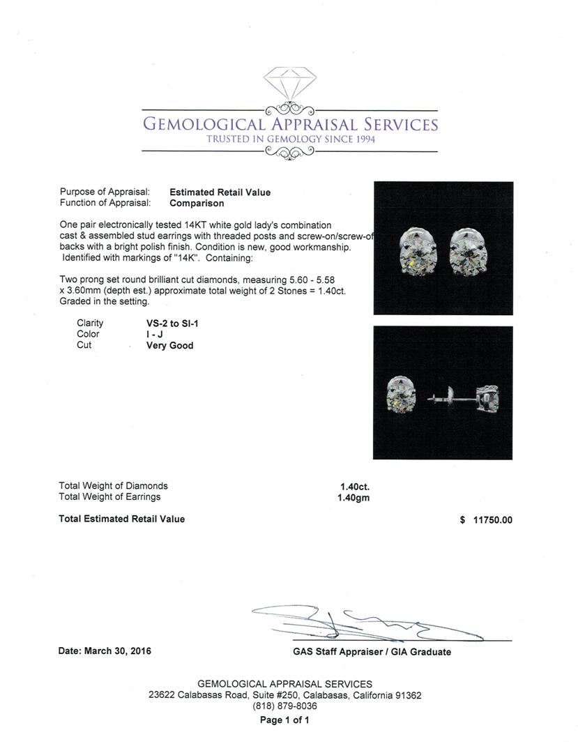 One pair electronically tested 14KT white gold lady's combination cast & assembled stud earrings with threaded posts and screw-on/screw-off backs with a bright polish finish. Identified with markings of "14K". Condition is new, good workmanship. Containing: Two prong set round brilliant cut diamonds, measuring 5.60 - 5.58 x 3.60mm (depth est.) approximate total weight of 2 Stones = 1.40ct. Graded in the setting. Clarity: VS-2 to SI-1. Color: I - J. Cut Very Good. Total Weight of Diamonds 1.40ct. Total Weight of Earrings 1.40gm GAS Appraised.