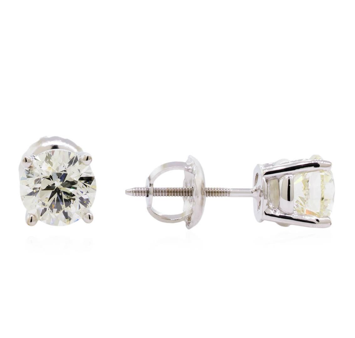 One pair electronically tested 14KT white gold lady's combination cast & assembled stud earrings with threaded posts and screw-on/screw-off backs with a bright polish finish. Identified with markings of "14K". Condition is new, good workmanship. Containing: Two prong set round brilliant cut diamonds, measuring 5.52 - 5.45 x 3.51mm (depth est.) , 5.00.%. GTCF approximate total weight of 2 Stones = 1.40ct. Graded in the setting. Clarity: VS-2 to SI-1. Color: I. Cut Very Good. Total Weight of Diamonds 1.40ct. Total Weight of Earrings 1.20gm. GAS Appraised at $12,790.00.