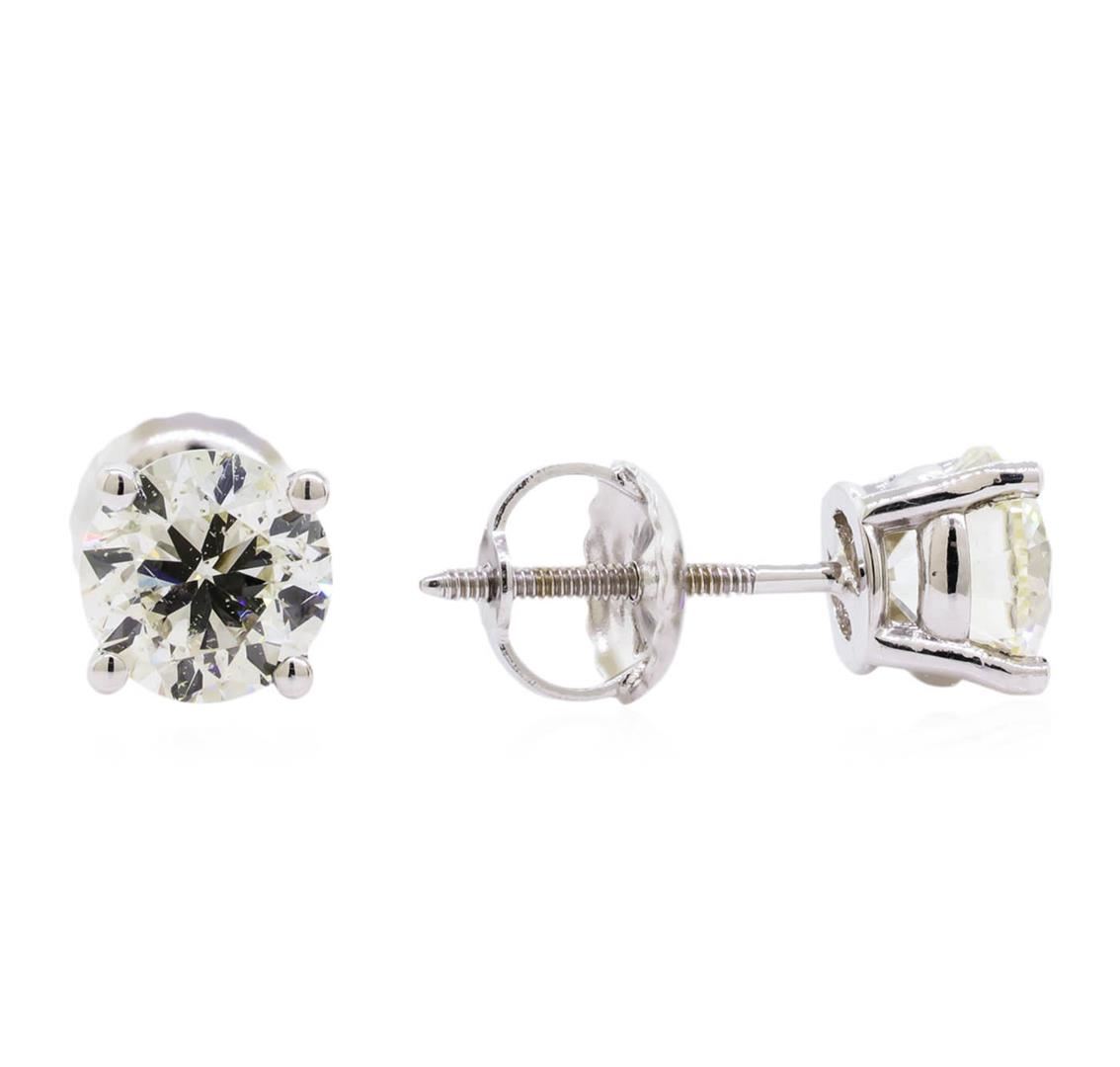 One pair electronically tested 14KT white gold lady's combination cast & assembled stud earrings with threaded posts and screw-on/screw-off backs with a bright polish finish. Identified with markings of "14K". Condition is new, good workmanship. Containing: Two prong set round brilliant cut diamonds, measuring 5.52 - 5.46 x 3.51mm (depth est.) , 5.00.%. GTCF approximate total weight of 2 Stones = 1.40ct. Graded in the setting. Clarity: SI-1. Color: I - Good. Total Weight of Diamonds 1.40ct. Total Weight of Earrings 1.20gm. GAS Appraised at $11,530.00.