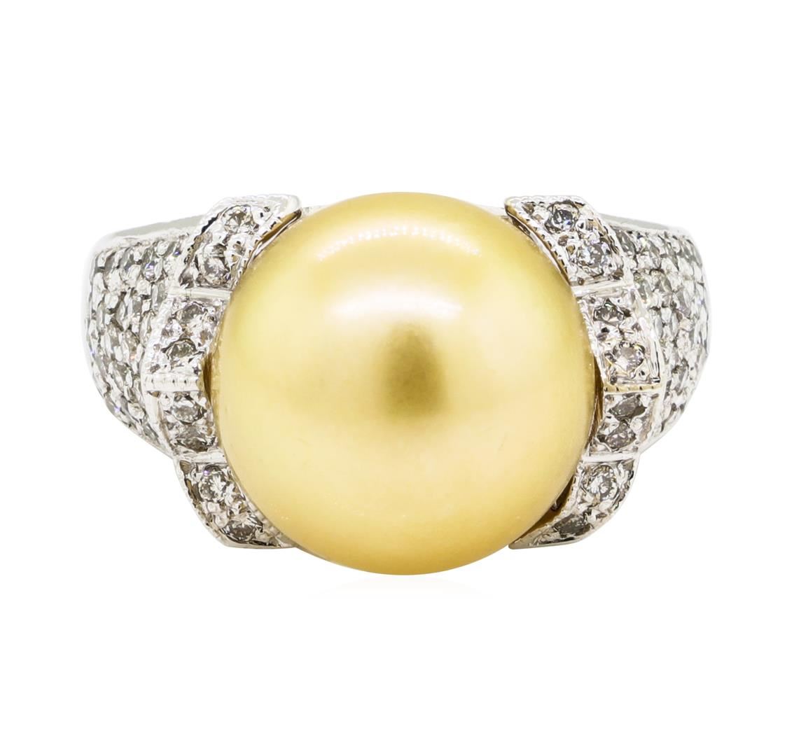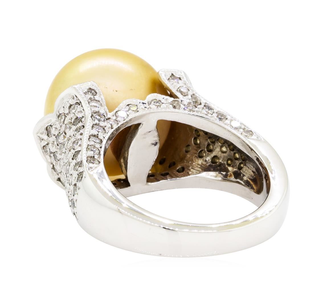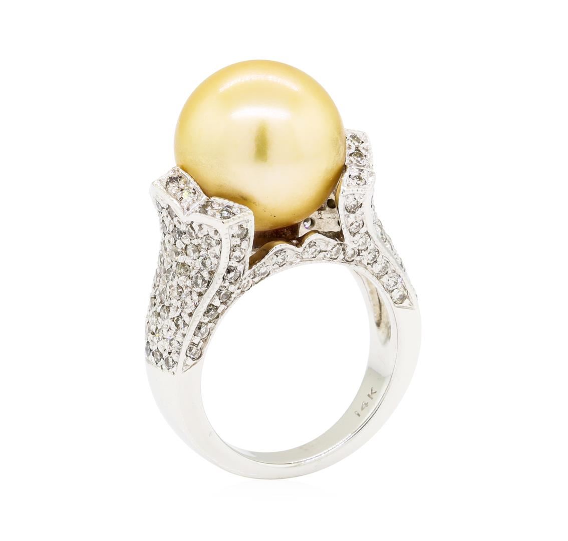 One electronically tested 14KT white gold lady's cast fashion ring with a tapered shank with a bright polish finish. The featured lady's ring has a shank measuring 3.20 millimeters wide. Identified with markings of '14K'. Condition is new, good workmanship. Containing: One south sea cultured pearl, 12.7mm to 12.6mm in size. The pearl is golden in color with a very good luster, round, and clean. Graded in the setting. One Hundred Thirty-Four prong set round brilliant cut diamonds, measuring 1.50 - 1.30 x 0.87mm (depth est.) approximate total weight of 134 Stones = 1.40ct. Graded in the setting. Color G - H Clarity VS-2 to SI-1 Cut Good. Total Weight of Diamonds 1.40ct.. Total Weight of Ring 12.30gm GAS Appraised at $6245.00. GAS Appraised at $6,245.00.