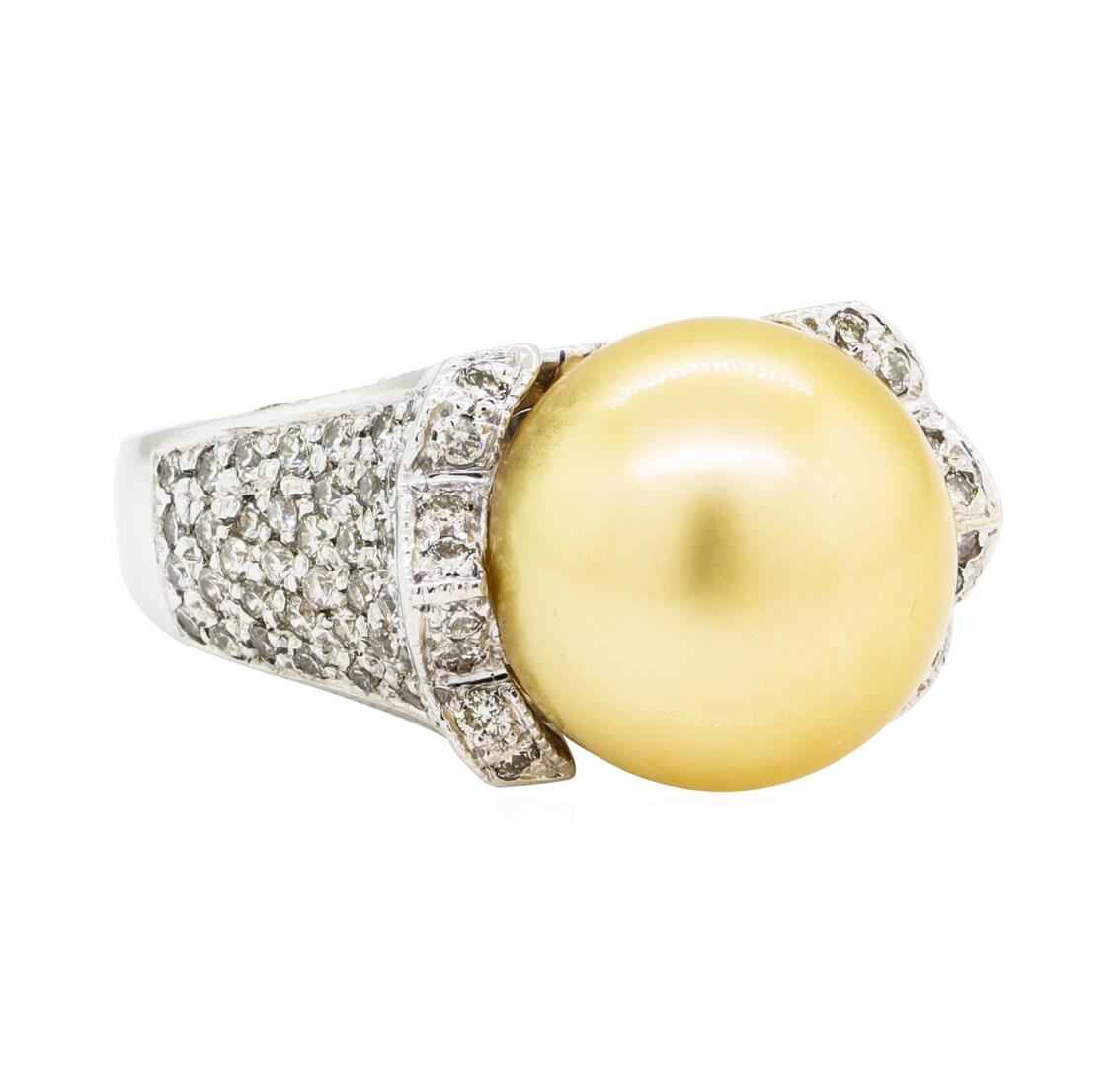 One electronically tested 14KT white gold lady's cast fashion ring with a tapered shank with a bright polish finish. The featured lady's ring has a shank measuring 3.20 millimeters wide. Identified with markings of '14K'. Condition is new, good workmanship. Containing: One south sea cultured pearl, 12.7mm to 12.6mm in size. The pearl is golden in color with a very good luster, round, and clean. Graded in the setting. One Hundred Thirty-Four prong set round brilliant cut diamonds, measuring 1.50 - 1.30 x 0.87mm (depth est.) approximate total weight of 134 Stones = 1.40ct. Graded in the setting. Color G - H Clarity VS-2 to SI-1 Cut Good. Total Weight of Diamonds 1.40ct.. Total Weight of Ring 12.30gm GAS Appraised at $6245.00. GAS Appraised at $6,245.00.