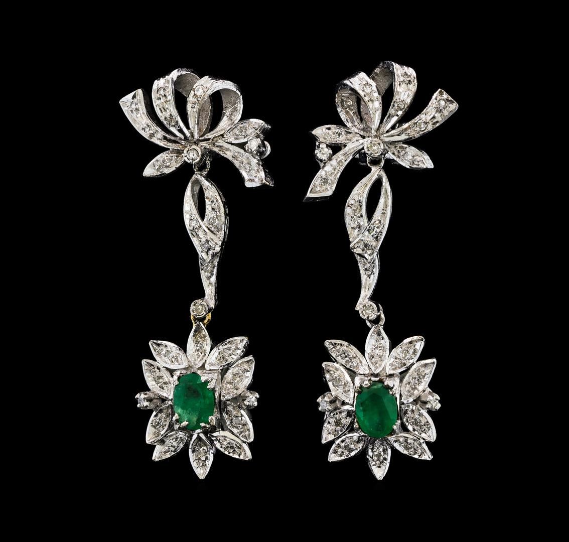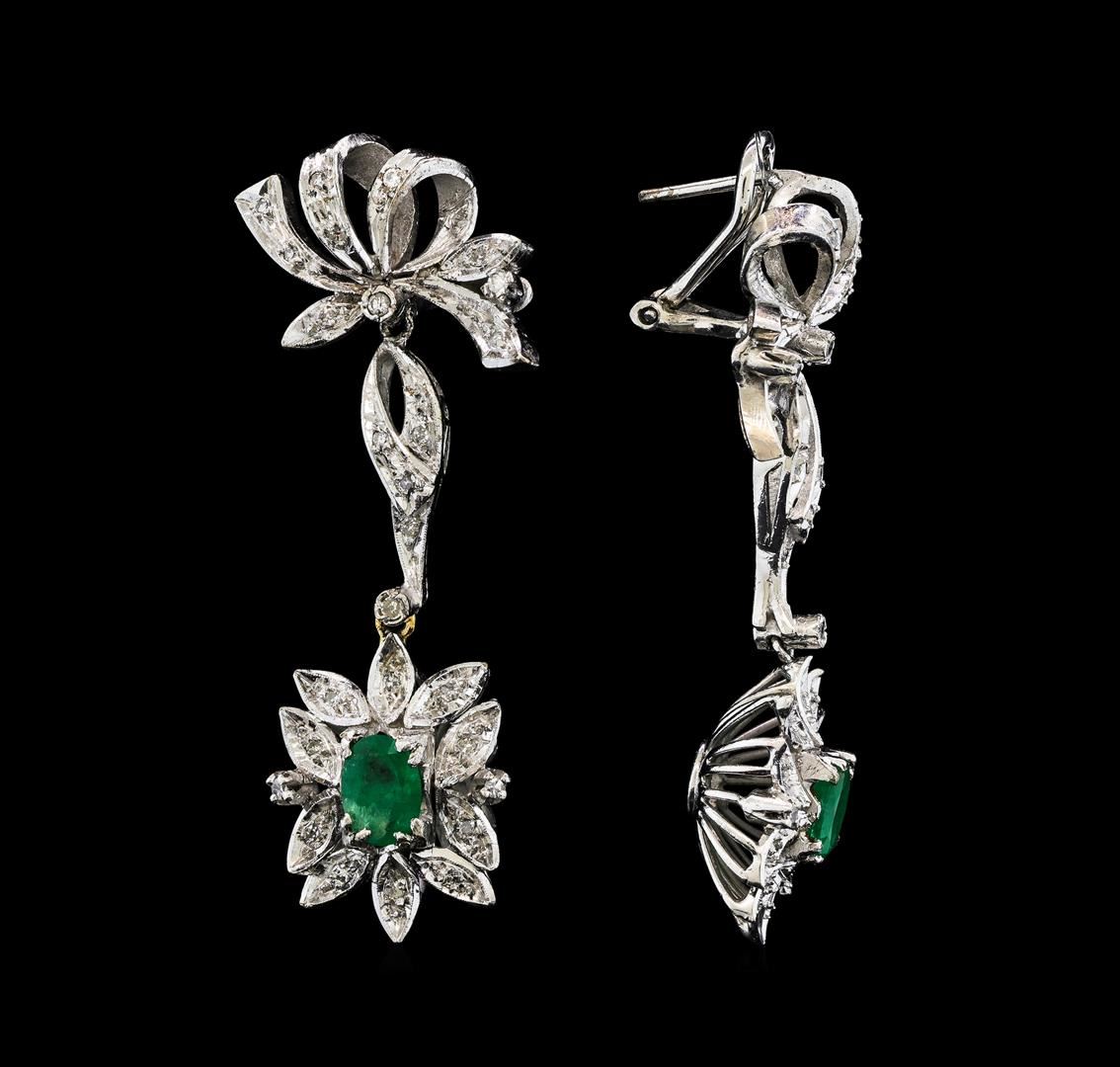 One pair electronically tested 9KT white gold lady's combination cast & assembled floral dangle earrings with Omega clip backs with posts with a bright polish with milgrain detailing finish. The featured pair of lady's earrings has a drop of approximately 50 millimeters. Condition is like new, good workmanship. Containing: Two prong set oval modified brilliant cut natural emeralds, measuring 7.24 x 5.25 x 3.25mm, (depth est.) approximate total weight of 1.40ct., clarity is heavily included, medium, moderately strong, green color, (GIA G 5/4), cut is good. Transmitting light somewhat diffusely, semi-transparent to translucent. Indications of oil residue. Naturally occurring internal & external characteristics are present. Colored gemstones are presumed to have been subjected to commonly used enhancement processes. Graded in the setting. Fifty-Six prong set single cut diamonds, measuring 1.50 - 1.25 x 0.86mm (depth est.) approximate total weight of 56 Stones = 0.56ct. Graded in the setting. Clarity SI-1 to I-1. Color: G - H Cut Good. Total Weight of Colored Stones 1.40ct.. Total Weight of Diamonds 0.56ct.. Total Weight of Earrings 13.70gm. GAS Appraised at $3,870.00.