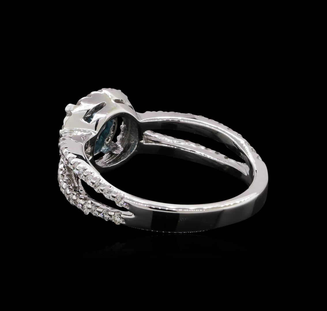One electronically tested 14KT white gold ladies cast diamond ring. The featured diamond is set within a diamond bezel supported by diamond set split shoulders, completed by a three millimeter wide band. Bright polish finish with milgrain detailing. Identified with markings of '14K'. Condition is new, good workmanship. Containing: One prong set round brilliant cut diamond, measuring 5.70 - 5.70 x 3.60mm (depth est.), 2.00.%. GTCF approximate weight of 0.73ct. Graded in the setting. Clarity I-2. Depth: 63.2%. Table: 59.7%. Seventy-Two prong set round brilliant cut diamonds, measuring 1.40 - 1.30 x 0.81mm (depth est.) approximate total weight of 72 Stones = 0.67ct. Graded in the setting. Clarity VS-2 to SI-1. Color: F - H. Total Weight of Diamonds 1.40ct.. Total Weight of Ring 4.89gm. AIG Appraised at $5,980.00.
