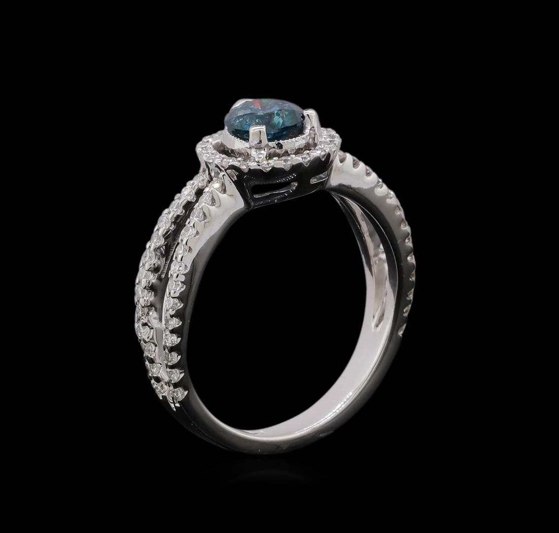 One electronically tested 14KT white gold ladies cast diamond ring. The featured diamond is set within a diamond bezel supported by diamond set split shoulders, completed by a three millimeter wide band. Bright polish finish with milgrain detailing. Identified with markings of '14K'. Condition is new, good workmanship. Containing: One prong set round brilliant cut diamond, measuring 5.70 - 5.70 x 3.60mm (depth est.), 2.00.%. GTCF approximate weight of 0.73ct. Graded in the setting. Clarity I-2. Depth: 63.2%. Table: 59.7%. Seventy-Two prong set round brilliant cut diamonds, measuring 1.40 - 1.30 x 0.81mm (depth est.) approximate total weight of 72 Stones = 0.67ct. Graded in the setting. Clarity VS-2 to SI-1. Color: F - H. Total Weight of Diamonds 1.40ct.. Total Weight of Ring 4.89gm. AIG Appraised at $5,980.00.