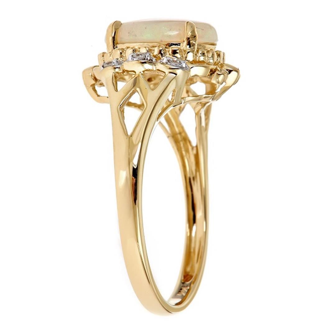 One Australian Opal and Diamond Ring featuring: 14KT Yellow Gold with a total weight of 2.71 grams, Australian Opal with a total weight of 1.40ct and 6 Diamonds with a total weight of 0.03ctw.