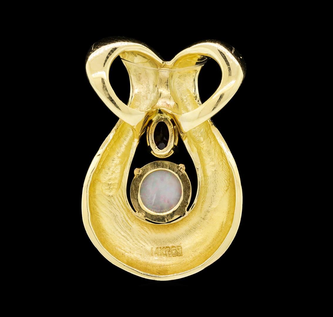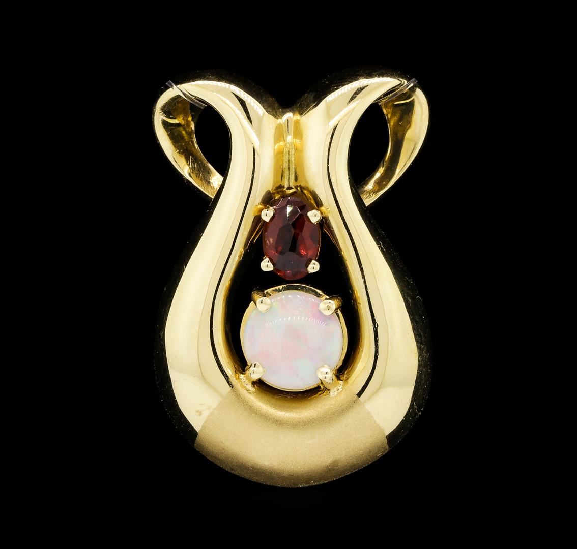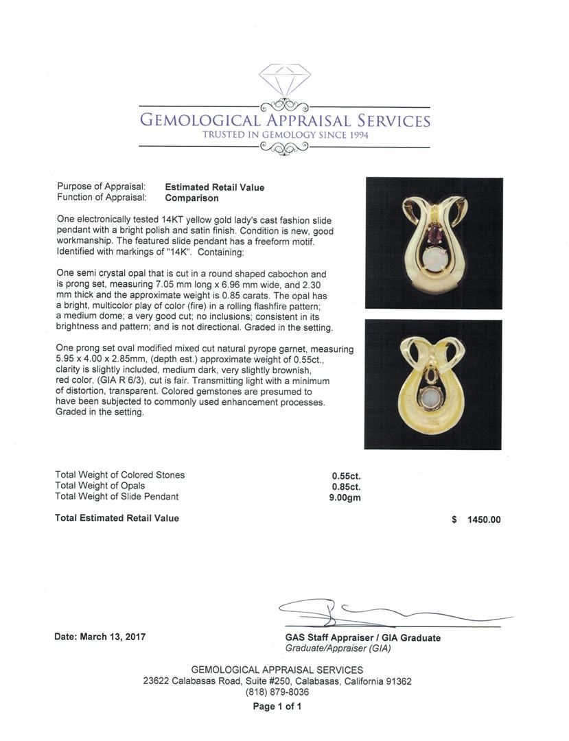 One electronically tested 14KT yellow gold lady's cast fashion slide pendant with a bright polish and satin finish. The featured slide pendant has a freeform motif. Identified with markings of '14K'. Condition is new, good workmanship. Containing: One semi crystal opal that is cut in a round shaped cabochon and is prong set, measuring 7.05 mm long x 6.96 mm wide, and 2.30 mm thick and the approximate weight is 0.85 carats. The opal has a bright, multicolor play of color (fire) in a rolling flashfire pattern; a medium dome; a very good cut; no inclusions; consistent in its brightness and pattern; and is not directional. Graded in the setting. One prong set oval modified mixed cut natural pyrope garnet, measuring 5.95 x 4.00 x 2.85mm, (depth est.) approximate weight of 0.55ct., clarity is slightly included, medium dark, very slightly brownish, red color, (GIA R 6/3), cut is fair. Transmitting light with a minimum of distortion, transparent. Colored gemstones are presumed to have been subjected to commonly used enhancement processes. Graded in the setting. Total Weight of Colored Stones 0.55ct.. Total Weight of Opals 0.85ct.. Total Weight of Slide Pendant 9.00gm GAS Appraised at $1,450.00.