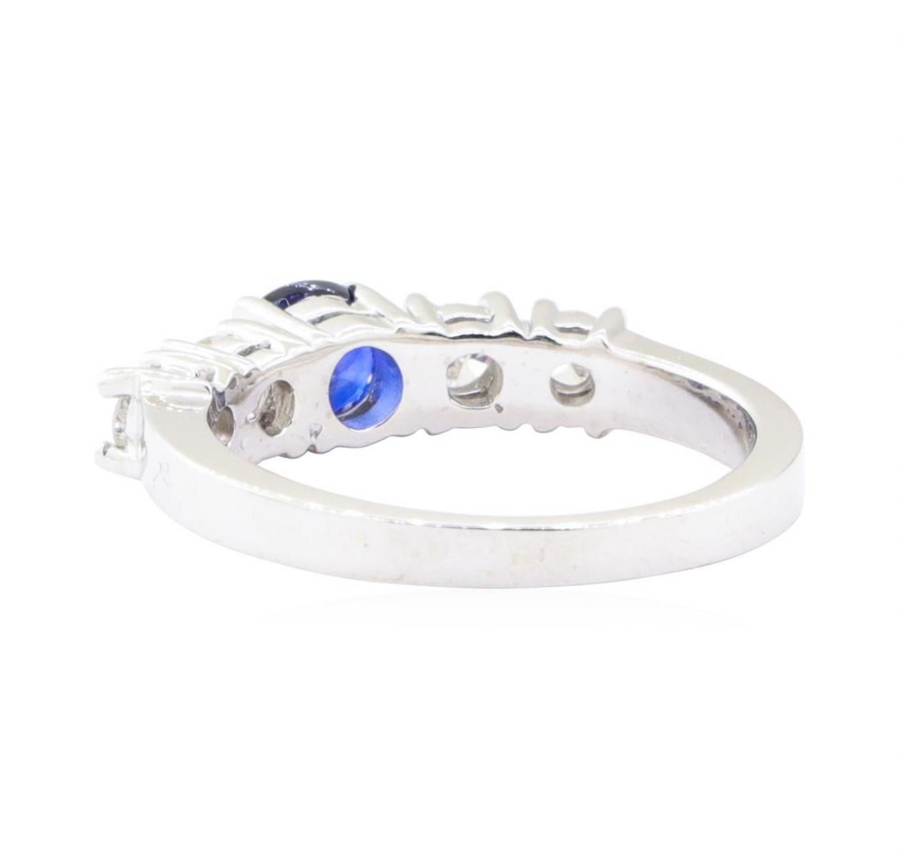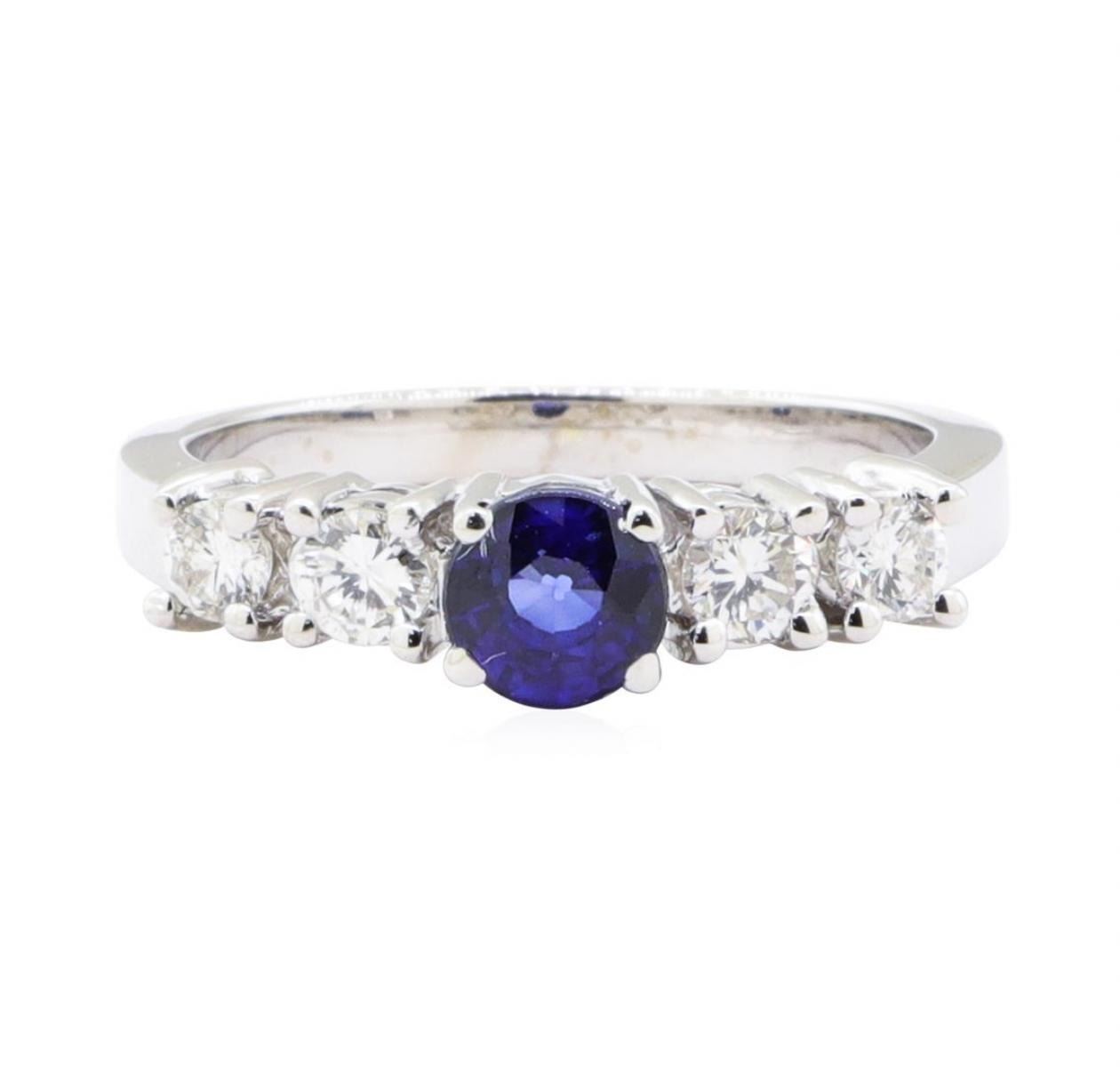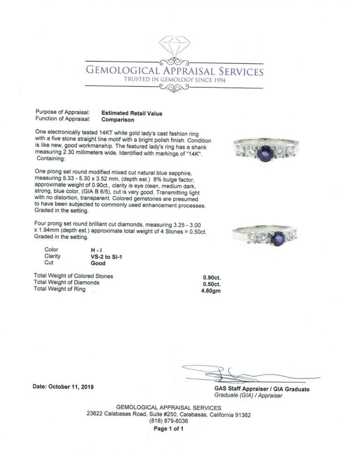 One electronically tested 14KT white gold lady's cast fashion ring with a five stone straight line motif with a bright polish finish. The featured lady's ring has a shank measuring 2.30 millimeters wide. Identified with markings of '14K'. Condition is Good. Containing: One prong set round modified mixed cut natural blue sapphire, measuring 5.33 - 5.30 x 3.52 mm, (depth est.) 8%. bulge factor, approximate weight of 0.90 ct., clarity is eye clean, medium dark, strong, blue color, (GIA B 6/5), cut is very good. Transmitting light with no distortion, transparent. Colored gemstones are presumed to have been subjected to commonly used enhancement processes. Graded in the setting. Four prong set round brilliant cut diamonds, measuring 3.25 - 3.00 x 1.94mm (depth est.) approximate total weight of 4 Stones = 0.50 ct. Graded in the setting. Color H - I Clarity VS-2 to SI-1 Cut Good. Total Weight of Colored Stones 0.90 ct.. Total Weight of Diamonds 0.50 ct.. Total Weight of Ring 4.60gm GAS Appraised at $3100.00. GAS Appraised.