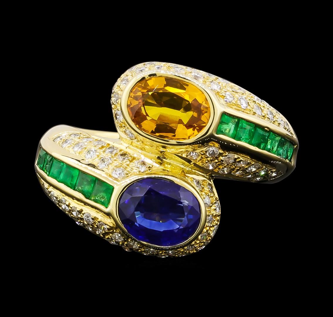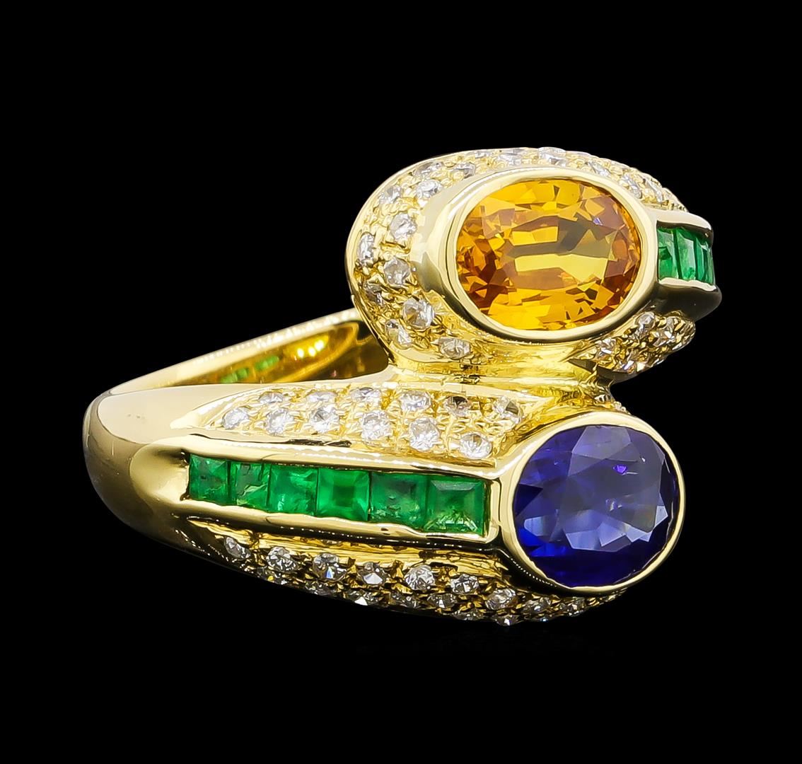 One ring featuring: 18KT Yellow Gold containing Sapphire with a total weight of 1.40ct, Emerald with a total weight of 0.40ct, and Diamonds with a total weight of 1.21ct. Total Weight of Ring: 6.9 grams.