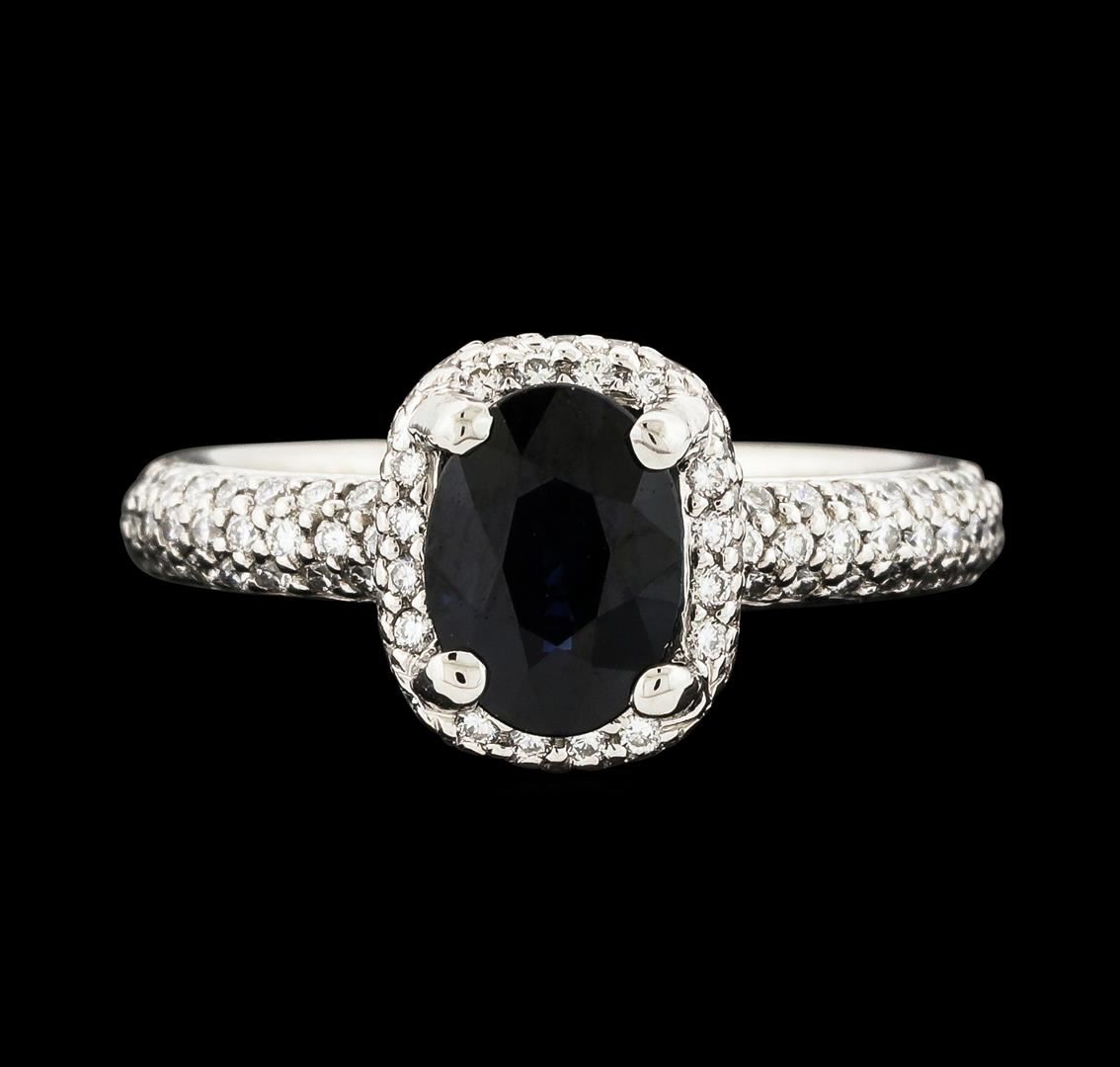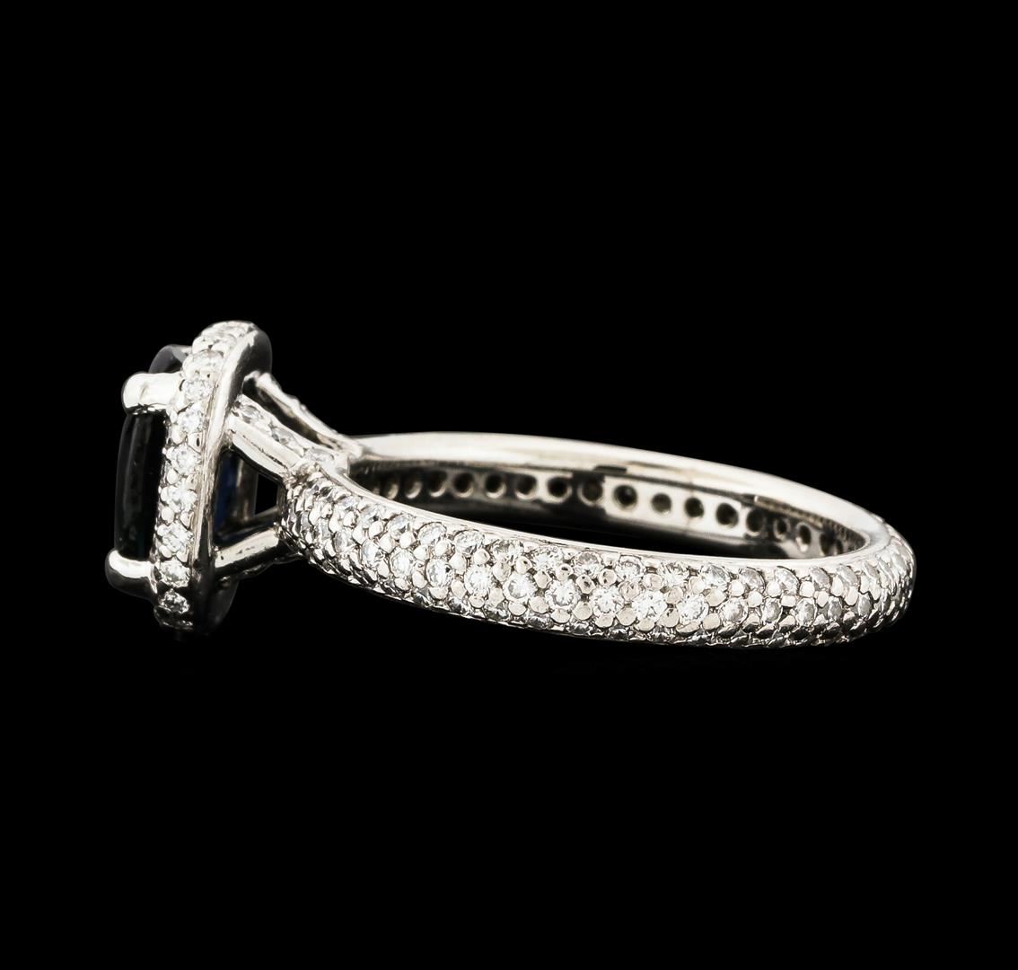One electronically tested platinum lady's cast fashion ring with a basket halo with a bright polish finish. The featured lady's eternity ring has a shank measuring 2.73 millimeters wide. Trademark is RITANI. Identified with markings of 'PT 950'. Condition is like new, good workmanship. Containing: One prong set oval modified brilliant cut natural blue sapphire, measuring 7.98 x 5.85 x 3.62mm, (depth est.) approximate weight of 1.40ct., clarity is slightly included, medium dark, moderately strong, blue color, (GIA B 6/4), cut is very good. Transmitting light somewhat diffusely, transparent to translucent. Colored gemstones are presumed to have been subjected to commonly used enhancement processes. Graded in the setting. One Hundred Seventy-Nine prong set round brilliant cut diamonds, measuring 1.25 - 1.15 x 0.74mm (depth est.) approximate total weight of 179 Stones = 1.20ct. Graded in the setting. Clarity VS-1 to VS-2. Color: F - G Cut Very Good. Total Weight of Colored Stones 1.40ct.. Total Weight of Diamonds 1.20ct.. Total Weight of Ring 5.50gm. GAS Appraised at $7,690.00.