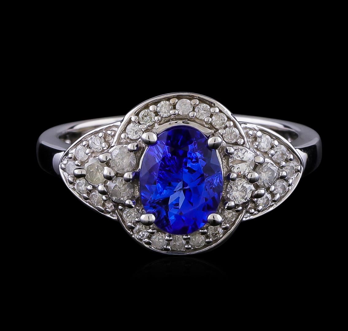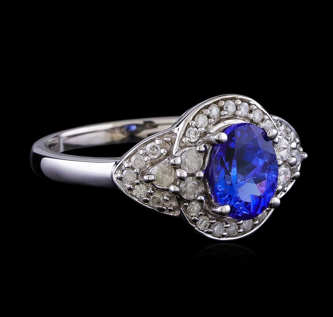 One electronically tested 14KT white gold ladies cast tanzanite and diamond ring with a bright polish finish. The featured tanzanite is set within a diamond bezel supported by diamond accented shoulders, completed by a two millimeter wide band. Trademark is Orianne. Identified with markings of "14K". Condition is new, good workmanship. Containing: One prong set oval mixed cut natural tanzanite approximate weight of 1.40ct., clarity is slightly included, type I, medium dark, very slightly grayish, violetish blue color, (GIA vB 6/3), cut is good. Transmitting light with a minimum of distortion, transparent. Naturally occurring internal & external characteristics are present. Graded in the setting. Tanzanite is a very rare gemstone that is only found in the country of Tanzania. Originally discovered in 1967. Tiffany & Company, named the stone Tanzanite. It is found in the Usumburu Mountains that border the Umba Valley of northern Tanzania. Tanzanite occurs in gray, brown, violet, blue, reddish-purple, & green. The gem is interesting because of its exceptional pleochroism. Rotated in different directions a tanzanite will exhibit multiple changes of color. Tanzanite has a low tolerance to ultrasonic cleaning, and should not be cleaned using this method. Thirty prong set round brilliant cut diamonds approximate total weight of 30 Stones = 0.36ct. Graded in the setting. Clarity: I-2 to I-3. Color: G - I. Total Weight of Colored Stones 1.40ct. Total Weight of Diamonds 0.36ct. Total Weight of Ring 3.96gm. AIG Appraised at $3,960.00.