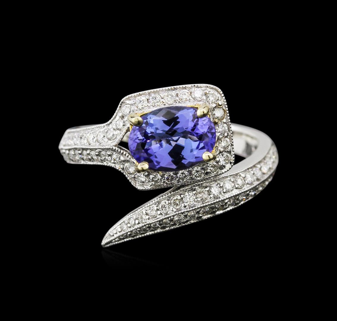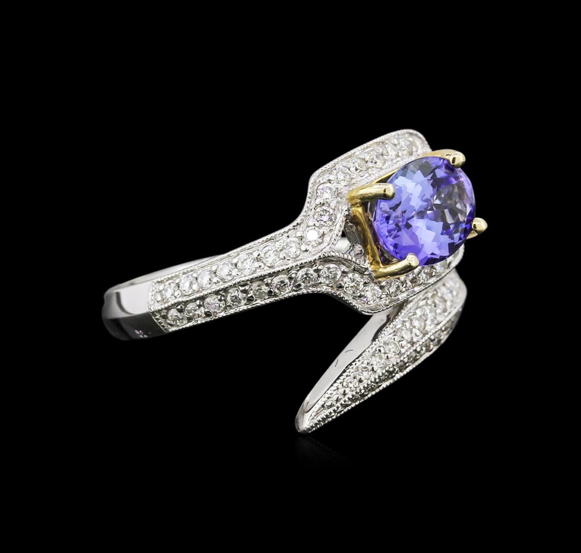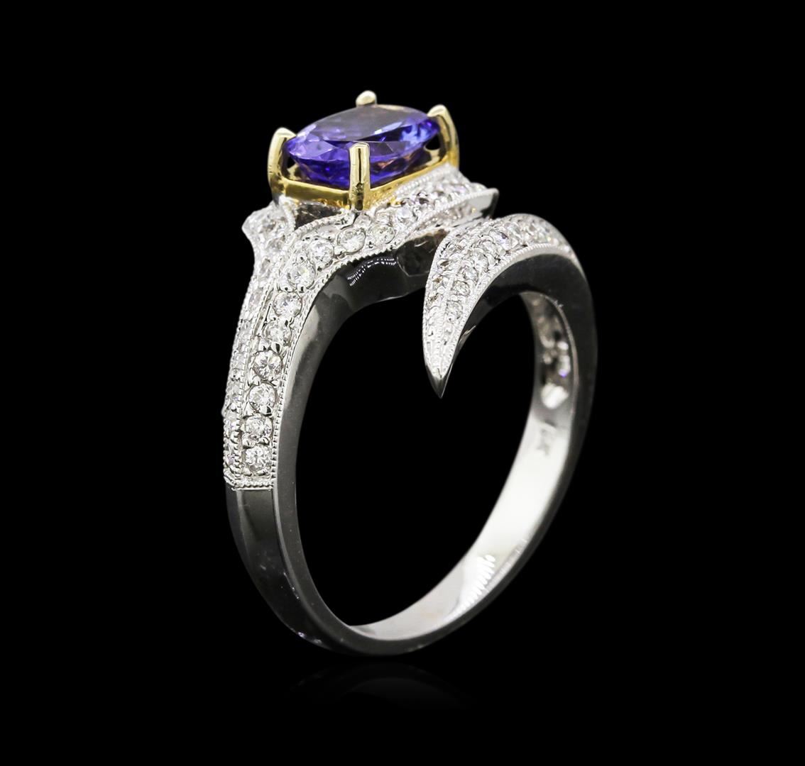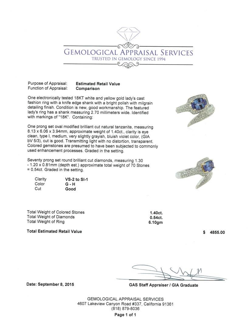 One electronically tested 18KT white and yellow gold lady's cast fashion ring with a knife edge shank with a bright polish with milgrain detailing finish. The featured lady's ring has a shank measuring 2.70 millimeters wide. Identified with markings of "18K". Condition is new, good workmanship. Containing: One prong set oval modified brilliant cut natural tanzanite, measuring 8.13 x 6.06 x 3.94mm, approximate weight of 1.40ct., clarity is eye clean, type I, medium, very slightly grayish, bluish violet color, (GIA bV 5/3), cut is good. Transmitting light with no distortion, transparent. Colored gemstones are presumed to have been subjected to commonly used enhancement processes. Graded in the setting. Seventy prong set round brilliant cut diamonds, measuring 1.30 - 1.20 x 0.81mm (depth est.) approximate total weight of 70 Stones = 0.54ct. Graded in the setting. Clarity: VS-2 to SI-1. Color: G - Good. Total Weight of Colored Stones 1.40ct. Total Weight of Diamonds 0.54ct. Total Weight of Ring 6.10gm. GAS Appraised at $4,855.00.