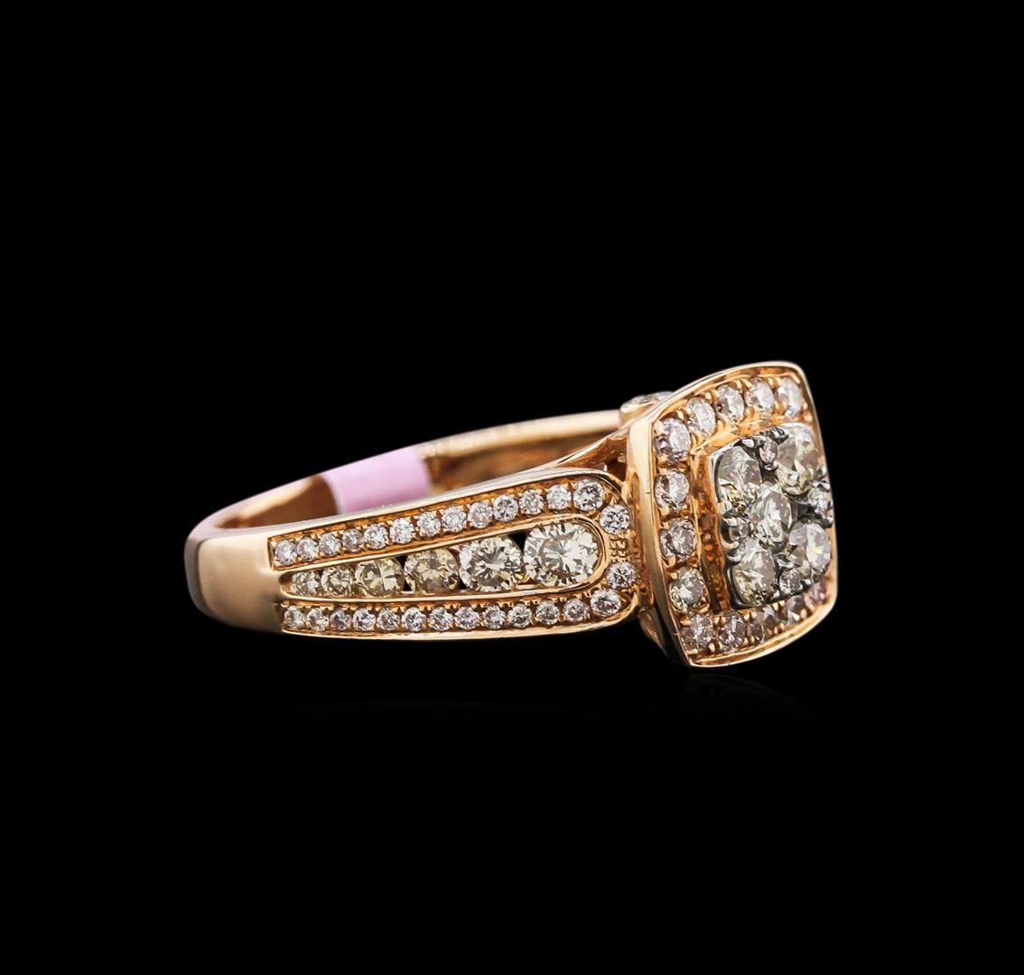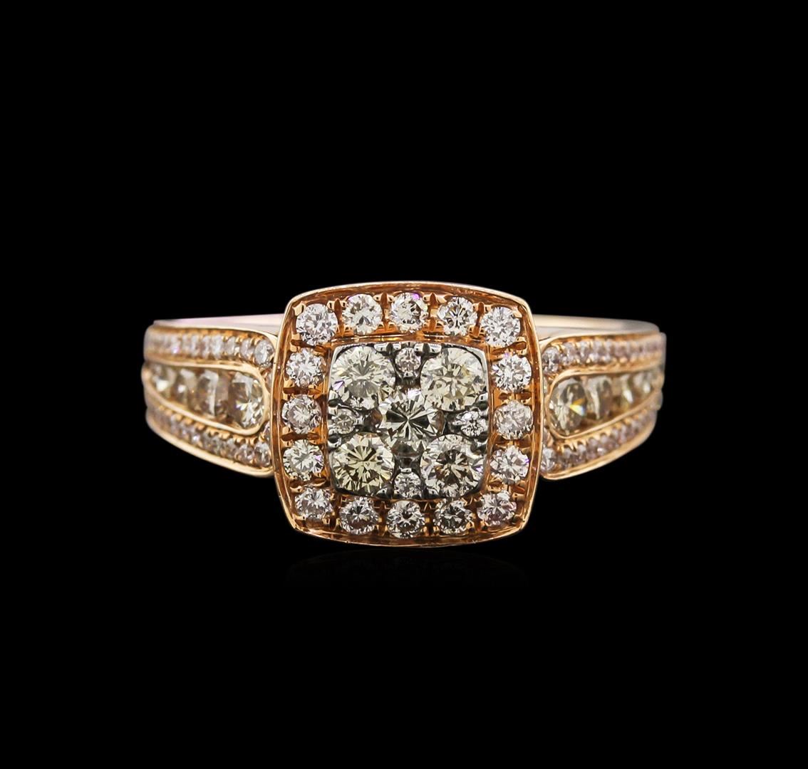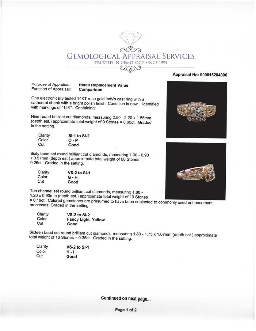 One electronically tested 14KT rose gold lady's cast ring with a cathedral shank with a bright polish finish. Condition is new. Identified with markings of "14K". Containing: Nine round brilliant cut diamonds, measuring 2.50 - 2.20 x 1.55mm (depth est.) approximate total weight of 9 Stones = 0.60ct. Graded in the setting. Clarity: SI-1 to SI-2. Color: O - P. Cut: Good. Sixty bead set round brilliant cut diamonds, measuring 1.00 - 0.90 x 0.57mm (depth est.) approximate total weight of 60 Stones = 0.26ct. Graded in the setting. Clarity: VS-2 to SI-1. Color: G - H. Cut: Good. Ten channel set round brilliant cut diamonds, measuring 1.80 - 1.20 x 0.90mm (depth est.) approximate total weight of 10 Stones = 0.19ct. Colored gemstones are presumed to have been subjected to commonly used enhancement processes. Graded in the setting. Clarity: VS-2 to SI-2. Color: Fancy Light Yellow. Cut: Good. Sixteen bead set round brilliant cut diamonds, measuring 1.80 - 1.75 x 1.07mm (depth est.) approximate total weight of 16 Stones = 0.35ct. Graded in the setting. Clarity: VS-2 to SI-1. Color: H - I. Cut: Good. Total Weight of Diamonds: 1.40ct. Total Weight of Ring: 5.00 gm. GAS Appraised at $6,070.00.