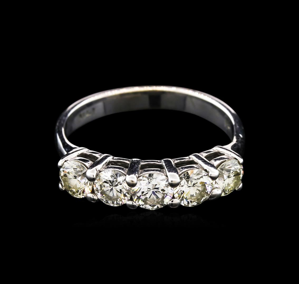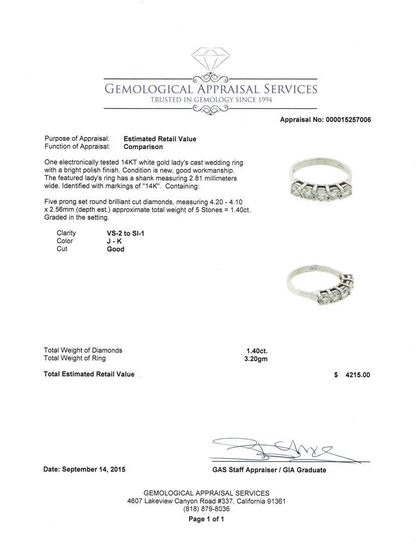 One electronically tested 14KT white gold lady's cast wedding ring with a bright polish finish. The featured lady's ring has a shank measuring 2.81 millimeters wide. Identified with markings of "14K". Condition is new, good workmanship. Containing: Five prong set round brilliant cut diamonds, measuring 4.20 - 4.10 x 2.56mm (depth est.) approximate total weight of 5 Stones = 1.40ct. Graded in the setting. Clarity: VS-2 to SI-1. Color: J - Good. Total Weight of Diamonds 1.40ct. Total Weight of Ring 3.20gm. GAS Appraised at $4,215.00.