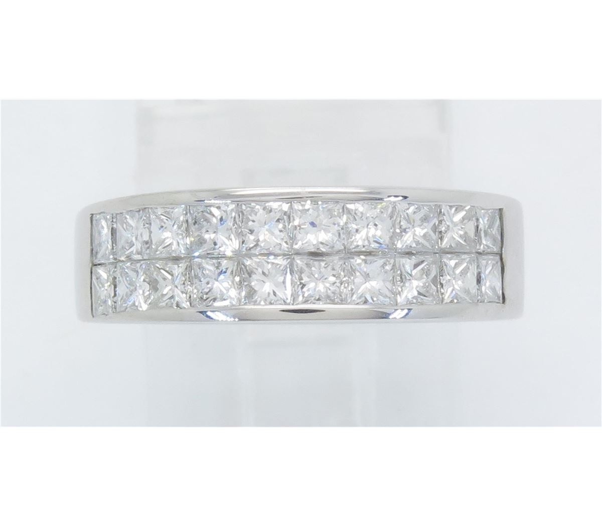 One tested 18K white gold diamond ring. Containing: 20 Princess Cut Diamonds, Clarity: VS-SI, Color: D-F. Approximate total diamond weight: 1.40CTW. All diamonds are graded in the mounting unless otherwise stated. Weight of ring: 4.9 grams, Size: 5.5.