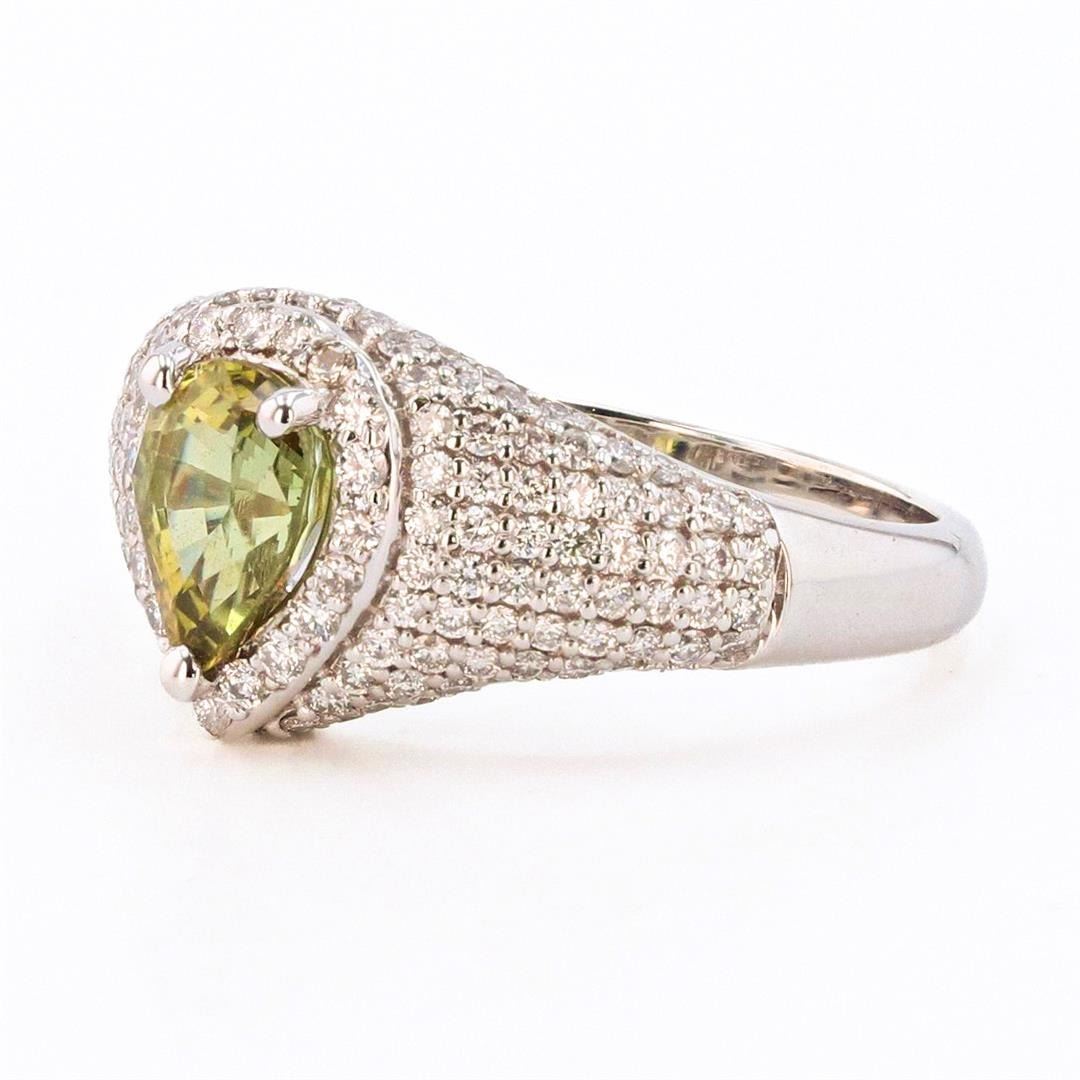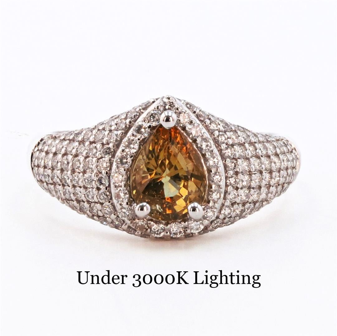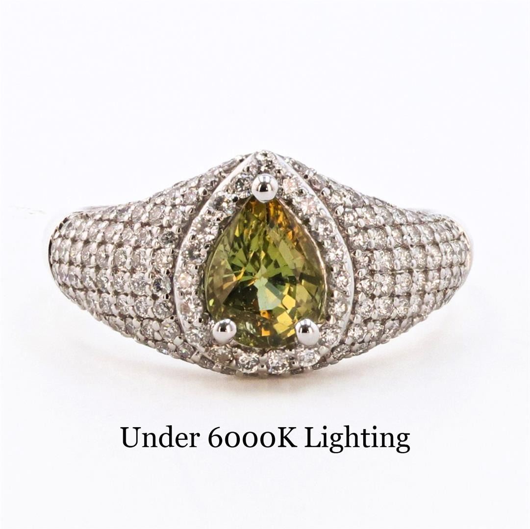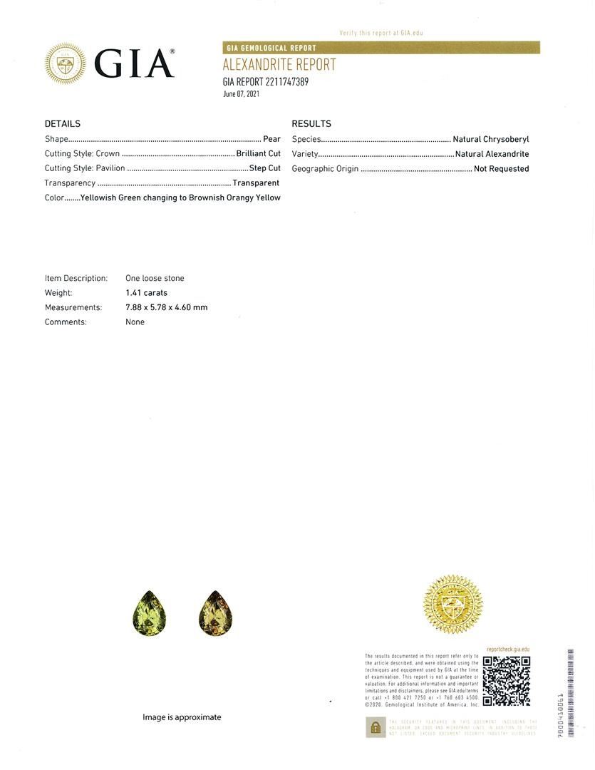 1.41ct Alexandrite and 0.84ctw Diamond Platinum Ring (GIA CERTIFIED). One electronically tested platinum ladies cast alexandrite and diamond ring. The featured alexandrite is set above a gallery of diamonds set on the curvature, supported by a lattice under gallery, completed by a two millimeter wide band. Trademark is Oscar Friedman. Identified with markings of "PT950". Bright polish finish. Condition is new, good workmanship Containing: One prong set pear mixed cut natural alexandrite, measuring 7.88 x 5.78 x 4.60mm, exact weight 1.41ct., type II Clarity is slightly included, medium dark, very slightly grayish, yellowish green color, (GIA yG 6/3) to medium dark, very slightly grayish, brownish orangy yellow, (GIA broY 6/3), cut is good. Transmitting light with no distortion, transparent. Naturally occurring internal & external characteristics are present. This stone exhibits a color change when viewed under daylight or fluorescent vs incandescent light. Graded loose prior to setting in the GIA Laboratory, Report No. 2211747389. The report is attached One hundred forty-eight prong set round brilliant cut diamonds approximate total weight of 148 Stones = 0.84ct. The clarity & color grade reflect the overall average for the group. The diamond count is approximate. Graded in the setting Clarity: VS-2 to SI-2 Color: F - H Total Weight of Colored Stones: 1.41ct Total Weight of Diamonds: 0.84ct Total Weight of Ring: 7.80 gm