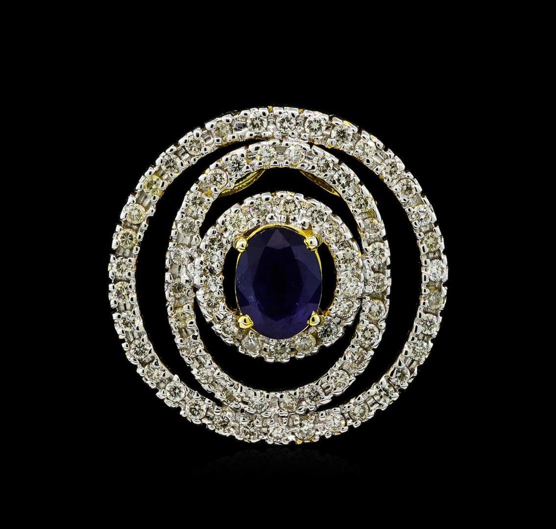 One electronically tested 14KT yellow gold lady's combination cast & assembled fashion pendant with a triple halo with a bright polish finish. The featured lady's pendant has a hidden bail and a total length of 23.5 millimeters. Identified with markings of '14K'. Condition is new, good workmanship. Containing: One prong set oval modified brilliant cut natural blue sapphire, measuring 7.65 x 5.88 x 3.43mm, (depth est.) 10%. bulge factor, approximate weight of 1.41ct., clarity is moderately included, medium, moderately strong, blue color, (GIA B 5/4), cut is good. Transmitting light somewhat diffusely, transparent to translucent. Colored gemstones are presumed to have been subjected to commonly used enhancement processes. Graded in the setting. Seventy-Five prong set round brilliant cut diamonds, measuring 1.50 - 1.45 x 0.92mm (depth est.) approximate total weight of 75 Stones = 0.93ct. Graded in the setting. Clarity SI-1 to SI-2. Color: H - J Cut Good. Total Weight of Colored Stones 1.41ct.. Total Weight of Diamonds 0.93ct.. Total Weight of Pendant 4.00gm GAS Appraised at $3,915.00.