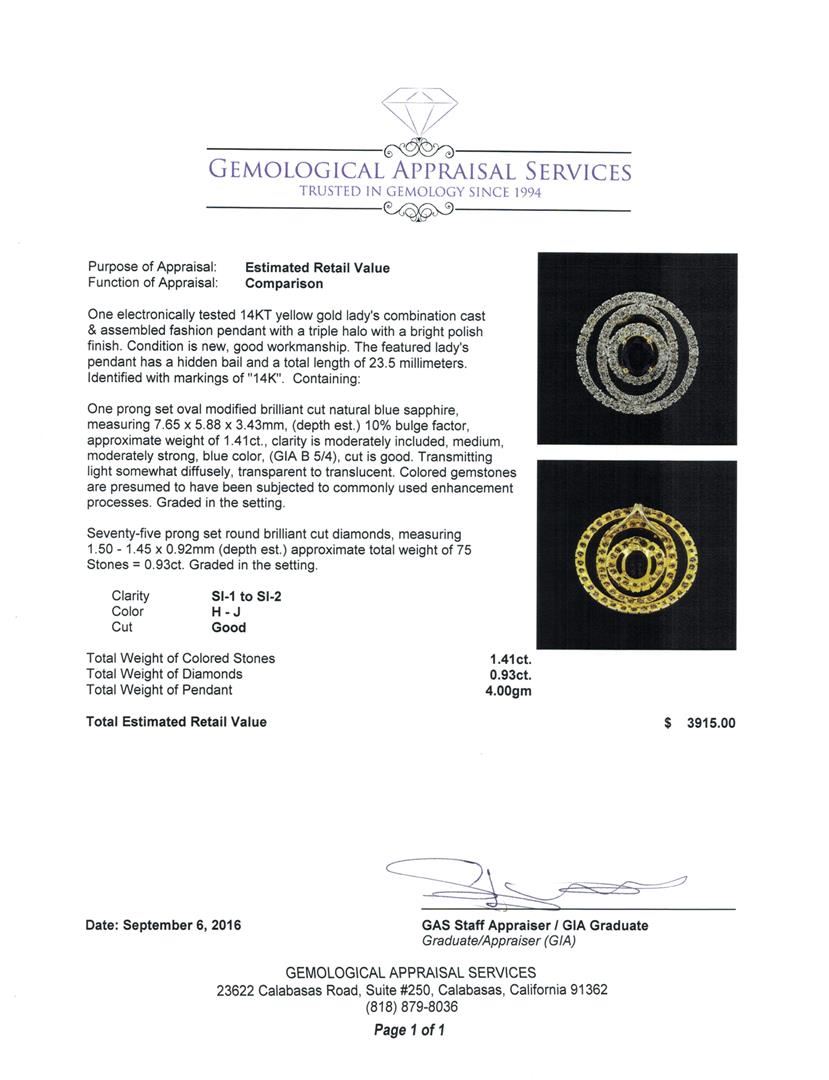One electronically tested 14KT yellow gold lady's combination cast & assembled fashion pendant with a triple halo with a bright polish finish. The featured lady's pendant has a hidden bail and a total length of 23.5 millimeters. Identified with markings of '14K'. Condition is new, good workmanship. Containing: One prong set oval modified brilliant cut natural blue sapphire, measuring 7.65 x 5.88 x 3.43mm, (depth est.) 10%. bulge factor, approximate weight of 1.41ct., clarity is moderately included, medium, moderately strong, blue color, (GIA B 5/4), cut is good. Transmitting light somewhat diffusely, transparent to translucent. Colored gemstones are presumed to have been subjected to commonly used enhancement processes. Graded in the setting. Seventy-Five prong set round brilliant cut diamonds, measuring 1.50 - 1.45 x 0.92mm (depth est.) approximate total weight of 75 Stones = 0.93ct. Graded in the setting. Clarity SI-1 to SI-2. Color: H - J Cut Good. Total Weight of Colored Stones 1.41ct.. Total Weight of Diamonds 0.93ct.. Total Weight of Pendant 4.00gm GAS Appraised at $3,915.00.
