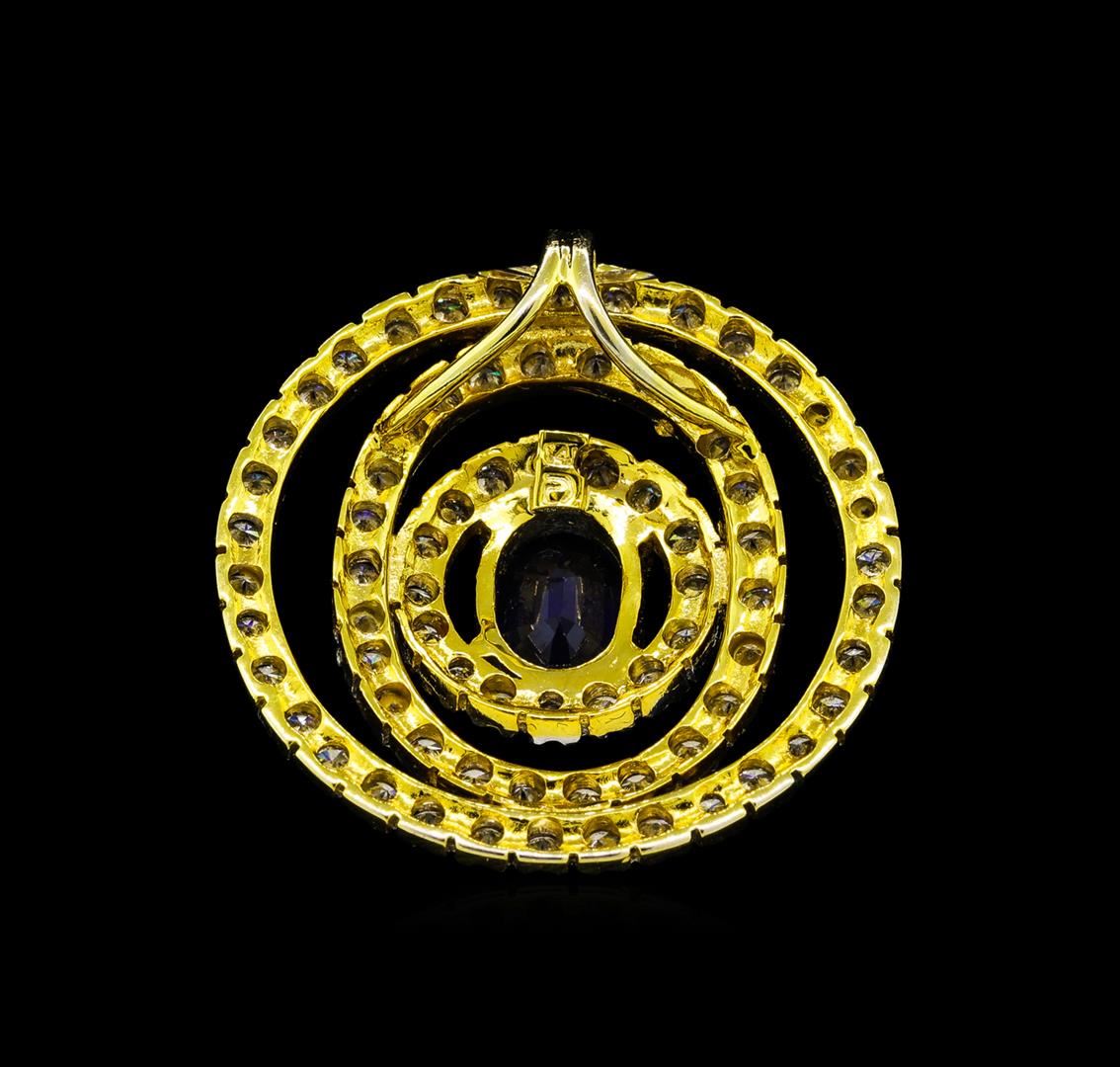 One electronically tested 14KT yellow gold lady's combination cast & assembled fashion pendant with a triple halo with a bright polish finish. The featured lady's pendant has a hidden bail and a total length of 23.5 millimeters. Identified with markings of '14K'. Condition is new, good workmanship. Containing: One prong set oval modified brilliant cut natural blue sapphire, measuring 7.65 x 5.88 x 3.43mm, (depth est.) 10%. bulge factor, approximate weight of 1.41ct., clarity is moderately included, medium, moderately strong, blue color, (GIA B 5/4), cut is good. Transmitting light somewhat diffusely, transparent to translucent. Colored gemstones are presumed to have been subjected to commonly used enhancement processes. Graded in the setting. Seventy-Five prong set round brilliant cut diamonds, measuring 1.50 - 1.45 x 0.92mm (depth est.) approximate total weight of 75 Stones = 0.93ct. Graded in the setting. Clarity SI-1 to SI-2. Color: H - J Cut Good. Total Weight of Colored Stones 1.41ct.. Total Weight of Diamonds 0.93ct.. Total Weight of Pendant 4.00gm GAS Appraised at $3,915.00.