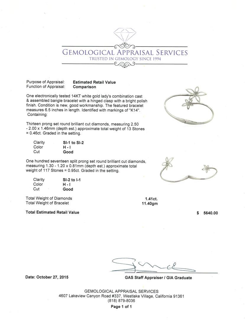 One electronically tested 14KT white gold lady's combination cast & assembled bangle bracelet with a hinged clasp with a bright polish finish. The featured bracelet measures 6.5 inches in length. Identified with markings of "K14". Condition is new, good workmanship. Containing: Thirteen prong set round brilliant cut diamonds, measuring 2.50 - 2.00 x 1.46mm (depth est.) approximate total weight of 13 Stones = 0.46ct. Graded in the setting. Clarity: SI-1 to SI-2. Color: H - I. Cut Good One Hundred Seventeen split prong set round brilliant cut diamonds, measuring 1.30 - 1.20 x 0.81mm (depth est.) approximate total weight of 117 Stones = 0.95ct. Graded in the setting. Clarity: SI-2 to I-1. Color: H - I. Cut Good. Total Weight of Diamonds 1.41ct. Total Weight of Bracelet 11.40gm. GAS Appraised at $5,640.00.