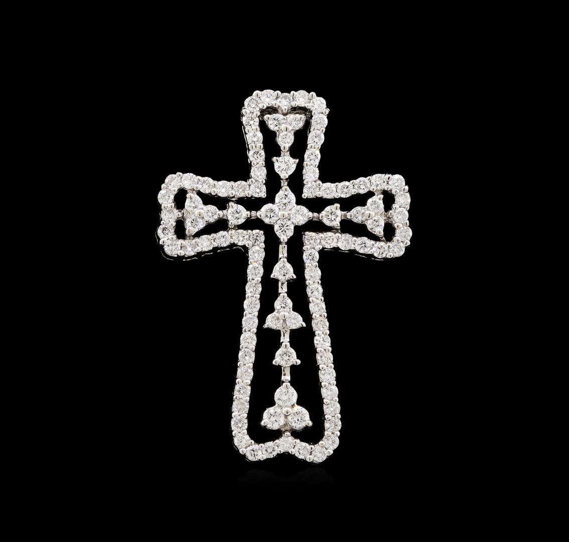 One electronically tested 18KT white gold cast cross pendant with a bright polish finish. Identified with markings of "18K 750". Condition is new, good workmanship. Containing: Ninety-Six prong set round brilliant cut diamonds, measuring 1.70 - 1.50 x 0.96mm (depth est.) approximate total weight of 96 Stones = 1.41ct. Graded in the setting. Clarity: VS-2 to SI-2. Color: H - I. Cut Very Good. Total Weight of Diamonds 1.41ct. Total Weight of Pendant 7.00gm. GAS Appraised at $5,595.00.