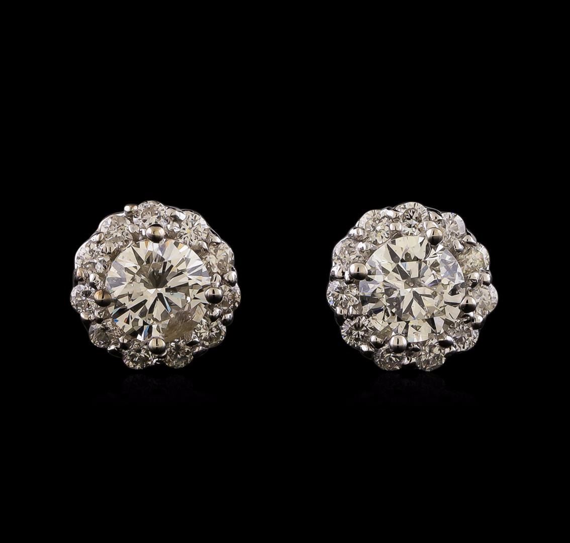 One pair electronically tested 14KT white gold lady's cast stud earrings with friction posts with a basket halo with a bright polish finish. Identified with markings of '14K'. Condition is new, good workmanship. Containing: Two prong set round brilliant cut diamonds, measuring 5.07 - 5.04 x 3.04mm (depth est.) , 5.00.%. GTCF approximate total weight of 2 Stones = 1.01ct. Graded in the setting. Clarity SI-2 to I-1. Color: H - I Cut Good Twenty-Two prong set round brilliant cut diamonds, measuring 1.75 - 1.65 x 1.04mm (depth est.) approximate total weight of 22 Stones = 0.40ct. Graded in the setting. Clarity VS-2 to SI-2. Color: G - H Cut Good. Total Weight of Diamonds 1.41ct.. Total Weight of Earrings 1.90gm. GAS Appraised at $7,230.00.
