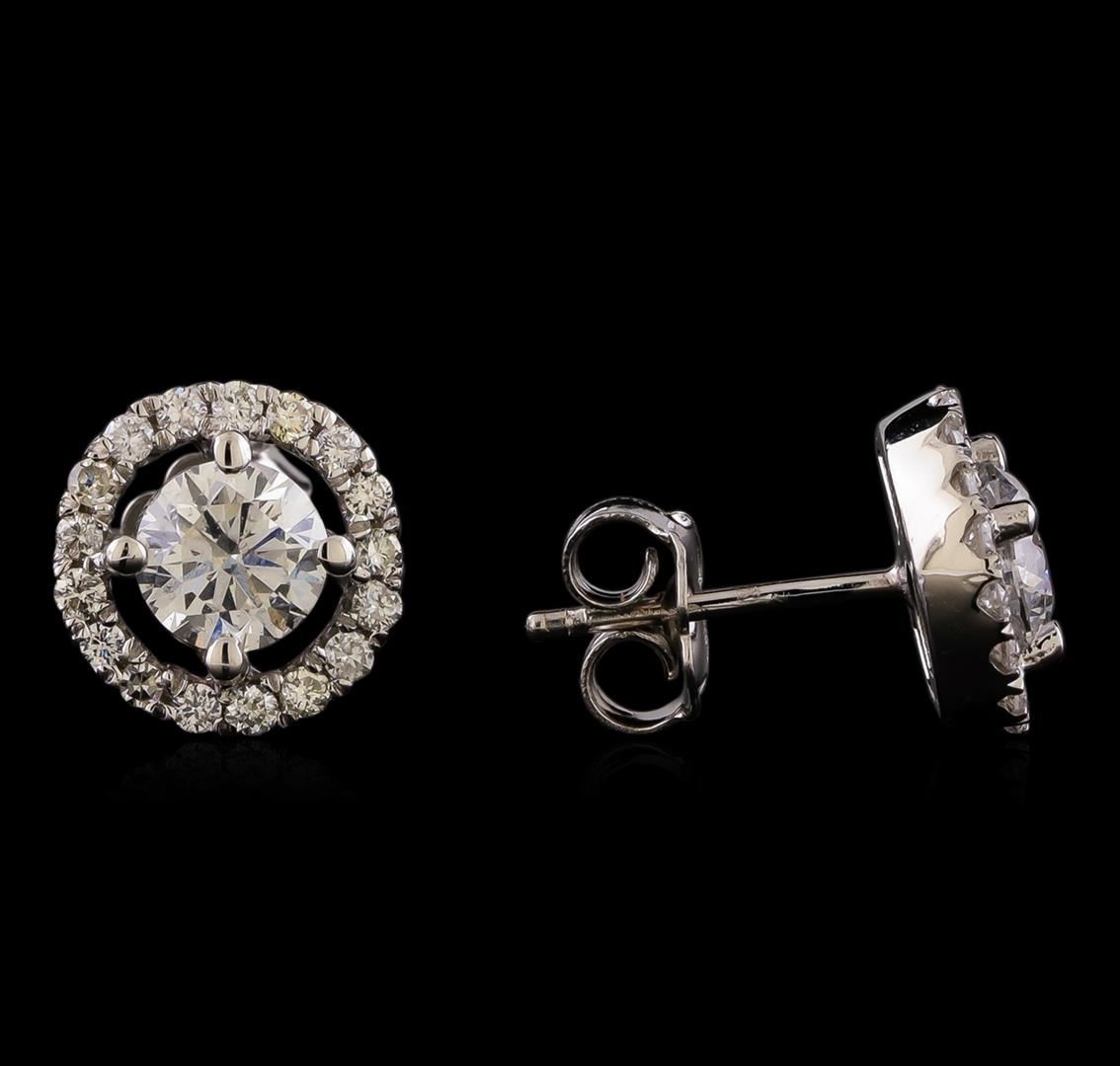 One pair electronically tested 14KT white gold lady's cast stud earrings with friction posts with a halo with a bright polish finish. Identified with markings of '14K'. Condition is new, good workmanship. Containing: Two prong set round brilliant cut diamonds, measuring 5.09 - 5.04 x 3.14mm (depth est.) , 7.00.%. GTCF approximate total weight of 2 Stones = 1.05ct. Graded in the setting. Clarity SI-1. Color: G - H Cut Good Thirty-Four prong set round brilliant cut diamonds, measuring 1.45 - 1.35 x 0.88mm (depth est.) approximate total weight of 34 Stones = 0.36ct. Graded in the setting. Clarity SI-1 to SI-2. Color: G - H Cut Good. Total Weight of Diamonds 1.41ct.. Total Weight of Earrings 2.60gm. GAS Appraised at $9,380.00.