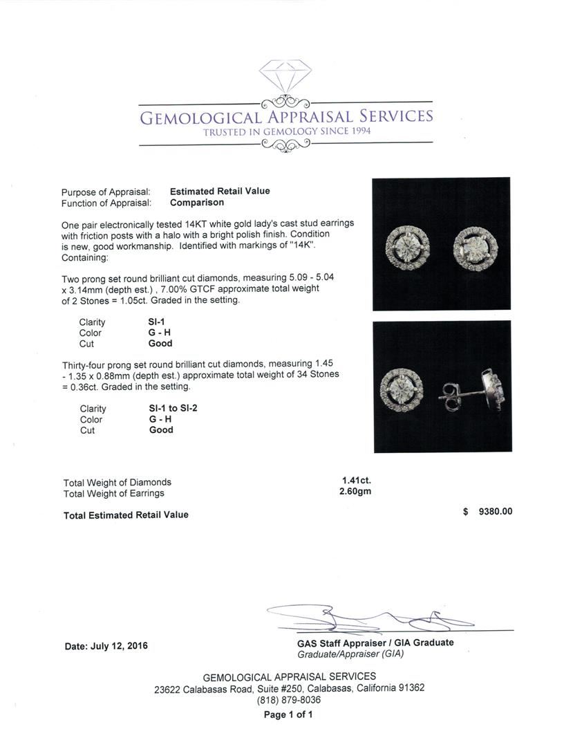 One pair electronically tested 14KT white gold lady's cast stud earrings with friction posts with a halo with a bright polish finish. Identified with markings of '14K'. Condition is new, good workmanship. Containing: Two prong set round brilliant cut diamonds, measuring 5.09 - 5.04 x 3.14mm (depth est.) , 7.00.%. GTCF approximate total weight of 2 Stones = 1.05ct. Graded in the setting. Clarity SI-1. Color: G - H Cut Good Thirty-Four prong set round brilliant cut diamonds, measuring 1.45 - 1.35 x 0.88mm (depth est.) approximate total weight of 34 Stones = 0.36ct. Graded in the setting. Clarity SI-1 to SI-2. Color: G - H Cut Good. Total Weight of Diamonds 1.41ct.. Total Weight of Earrings 2.60gm. GAS Appraised at $9,380.00.