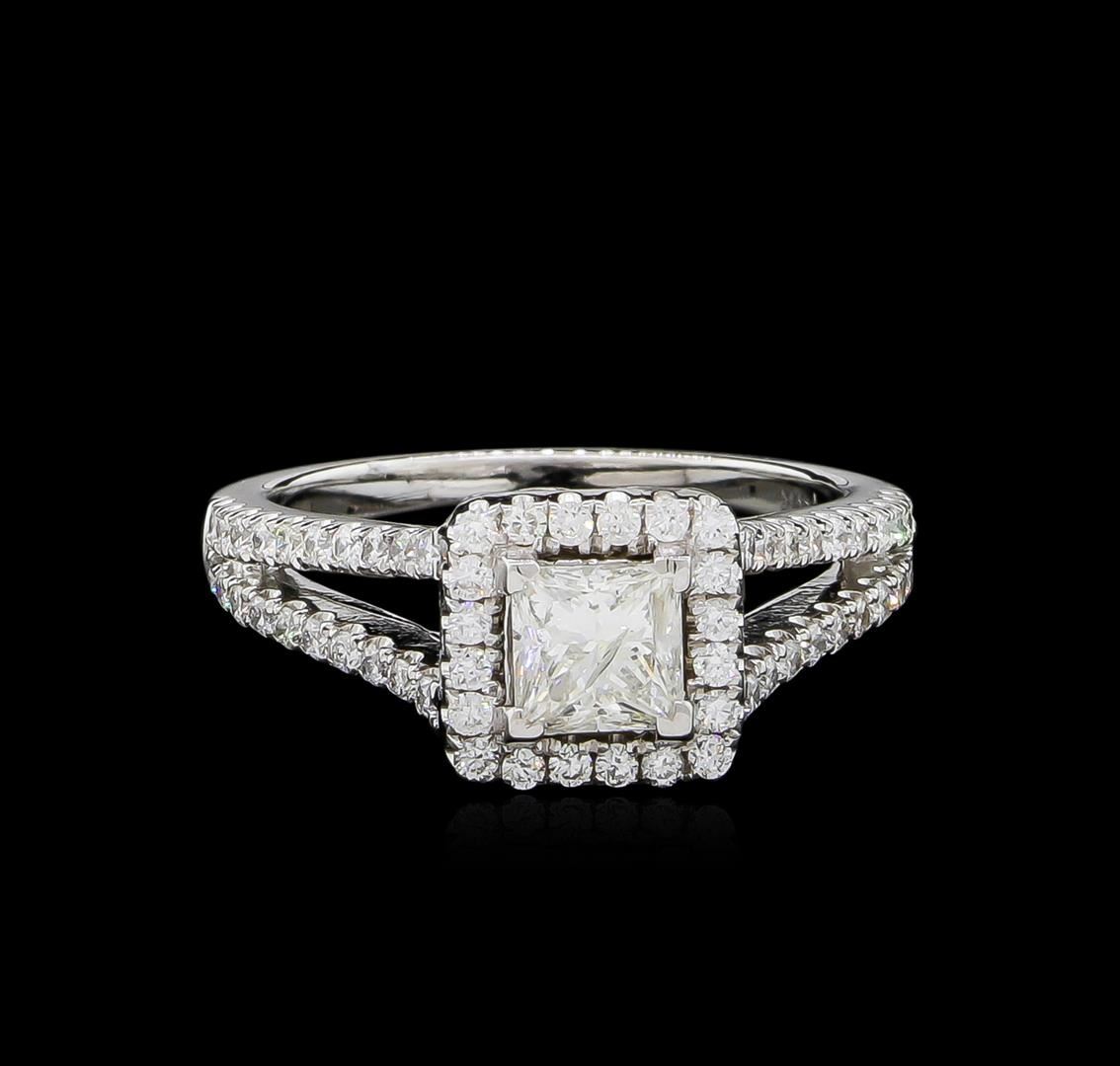 One electronically tested 14KT white gold ladies cast diamond unity ring with a bright polish finish. The featured diamond is set within a diamond bezel supported by a tuliped under gallery and diamond set split shoulders, completed by a one millimeter wide band. Identified with markings of "14K". Condition is good. Containing: One prong set princess cut diamond, measuring 5.00 x 5.00 x 3.70mm (depth est.) approximate weight of 0.76ct. Graded in the setting. Clarity: I-1. Color: I. Depth 74.0%. Table 71.0%. Sixty prong set round brilliant cut diamonds, measuring 1.40 - 1.40 x 0.84mm (depth est.) approximate total weight of 60 Stones = 0.65ct. Graded in the setting. Clarity: SI-1 to SI-2. Color: G - I. Total Weight of Diamonds 1.41ct. Total Weight of Ring 5.25gm. AIG Appraised at $6,820.00.