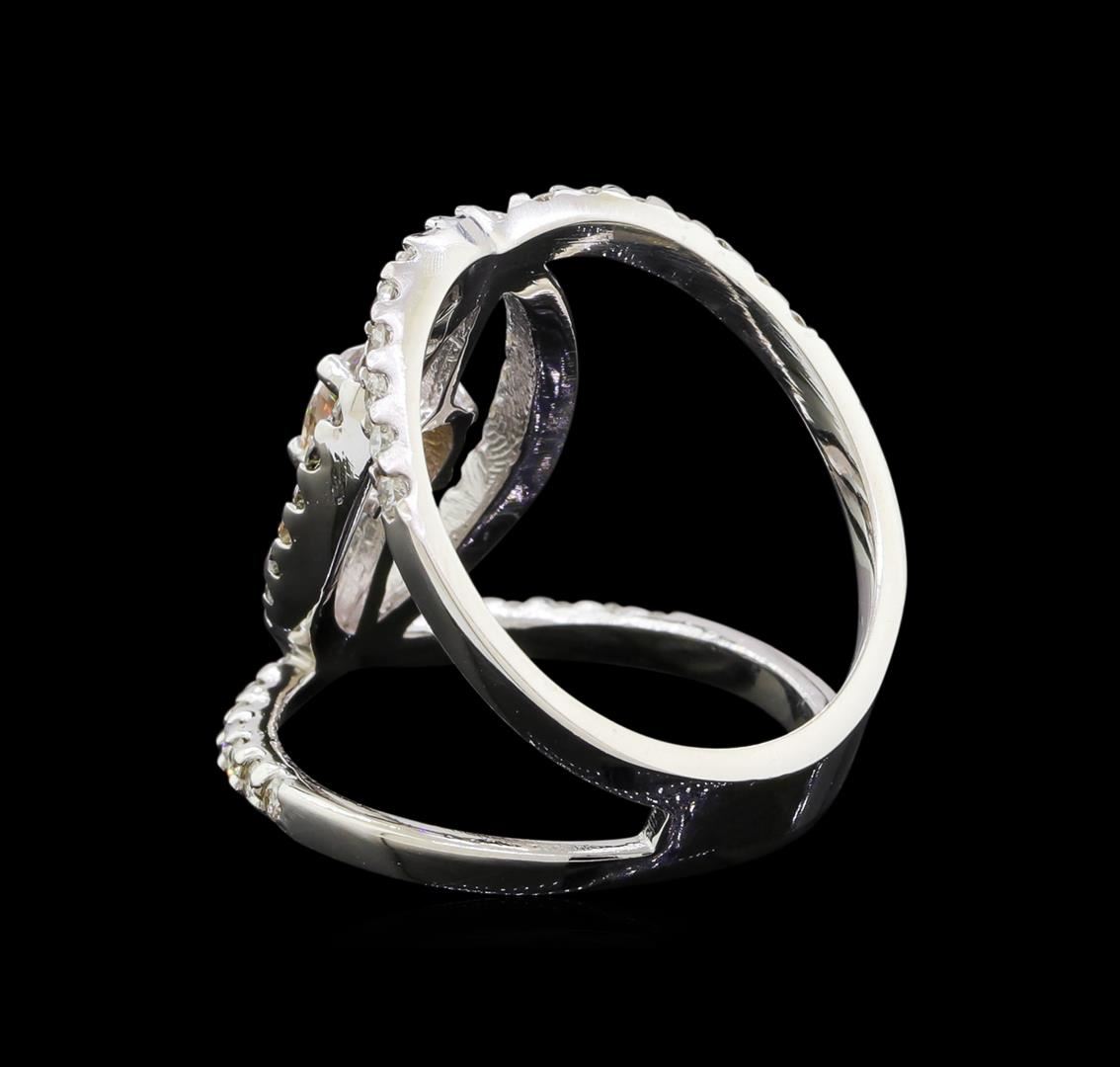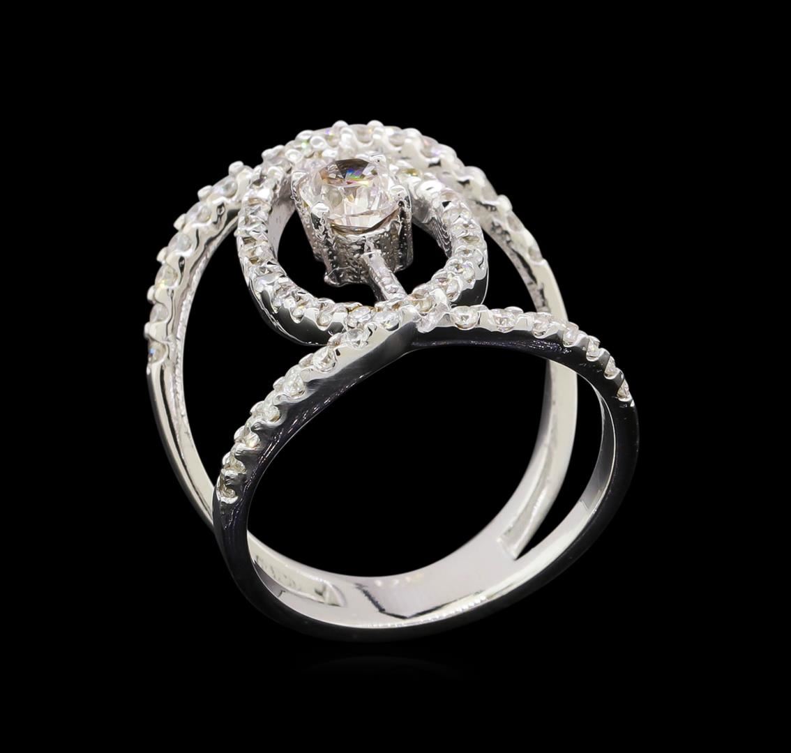 One electronically tested 14KT white gold lady's cast fashion ring with a bright polish finish. The featured lady's ring has a shank measuring 5.51 millimeters wide. Identified with markings of '14K'. Condition is new, good workmanship. Containing: One prong set cushion cut diamond, measuring 5.21 x 4.50 x 3.09mm (depth est.) approximate weight of 0.60ct. Graded in the setting. Clarity I-1. Color: J - K Cut Good Fifty-Four prong set round brilliant cut diamonds, measuring 1.60 - 1.55 x 0.98mm (depth est.) approximate total weight of 54 Stones = 0.81ct. Graded in the setting. Clarity SI-1 to I-1. Color: G - I Cut Good. Total Weight of Diamonds 1.41ct.. Total Weight of Ring 6.30gm. GAS Appraised at $5,260.00.