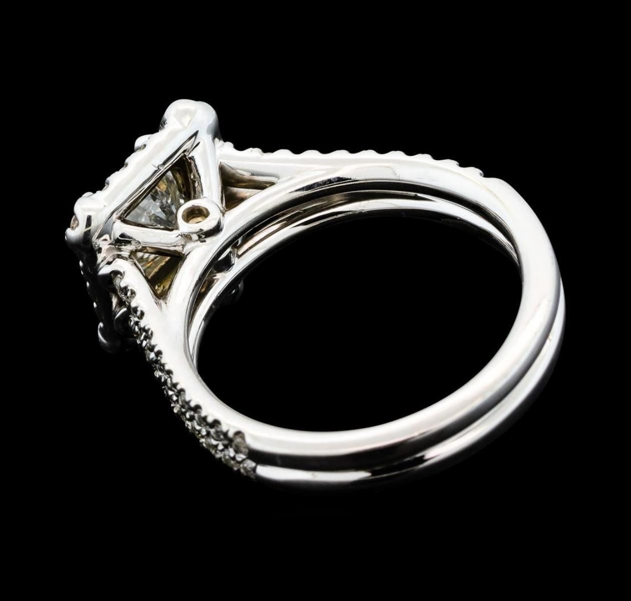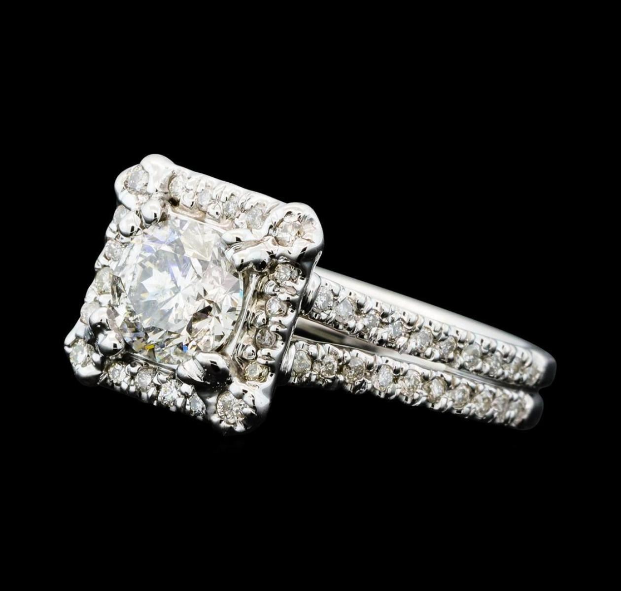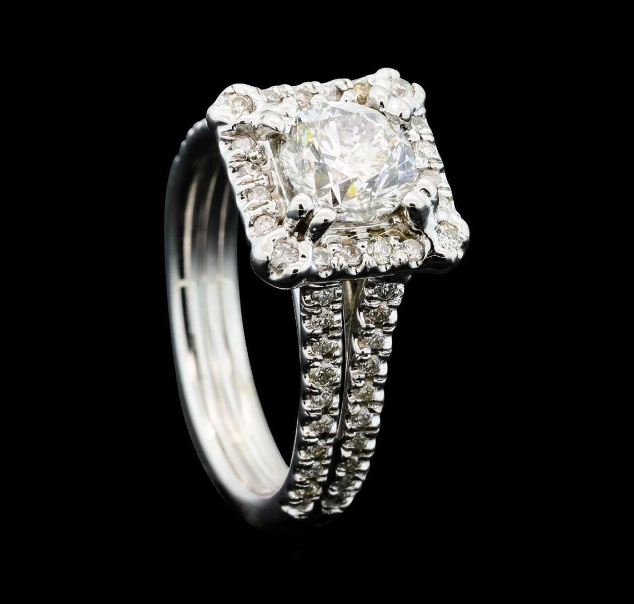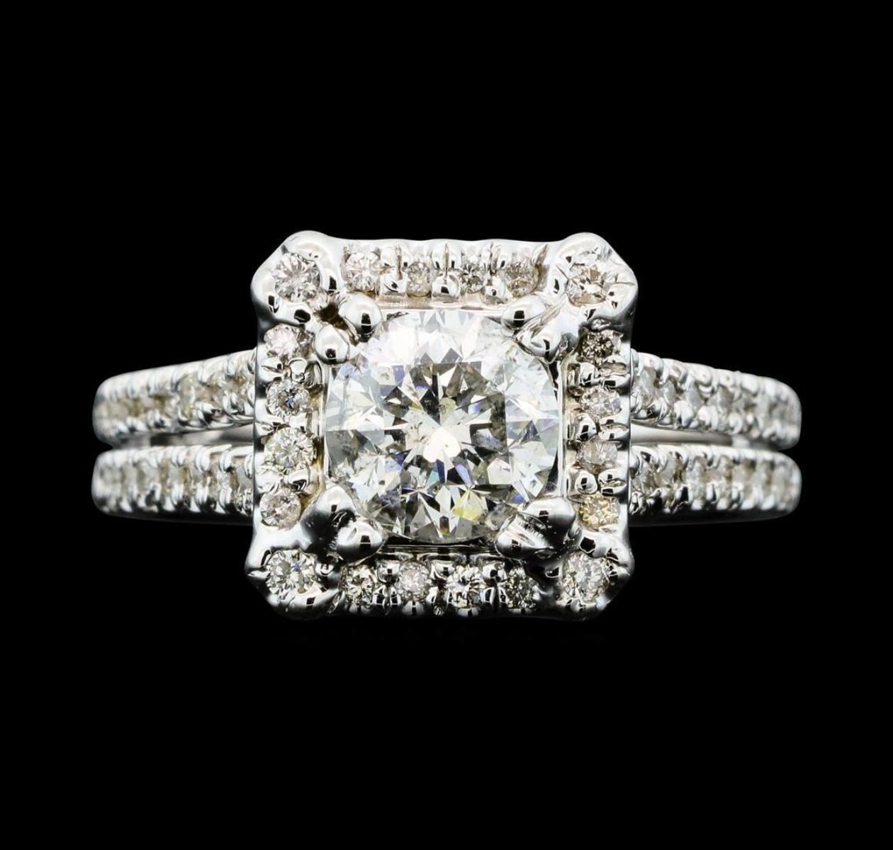 One electronically tested 14KT white gold lady's cast wedding ring with a split cathedral shank with a halo with a bright polish finish. The featured lady's ring has a double shank measuring 3.46 millimeters wide. Identified with markings of '14K'. Condition is new, good workmanship. Containing: One prong set round brilliant cut diamond, measuring 6.28 - 6.25 x 4.30mm (depth est.) approximate weight of 1.04ct. Graded in the setting. Clarity I-1. Color: I - J Cut Very Good Four prong set round brilliant cut diamonds, measuring 1.50 - 1.40 x 0.90mm (depth est.) approximate total weight of 4 Stones = 0.05ct. Graded in the setting. Clarity SI-1 to SI-2. Color: H - I Cut Good Fifty-Six prong set round brilliant cut diamonds, measuring 1.20 - 1.10 x 0.71mm (depth est.) approximate total weight of 56 Stones = 0.32ct. Graded in the setting. Clarity SI-2 to I-1. Color: H - I Cut Good. Total Weight of Diamonds 1.41ct.. Total Weight of Ring 5.80gm. GAS Appraised.