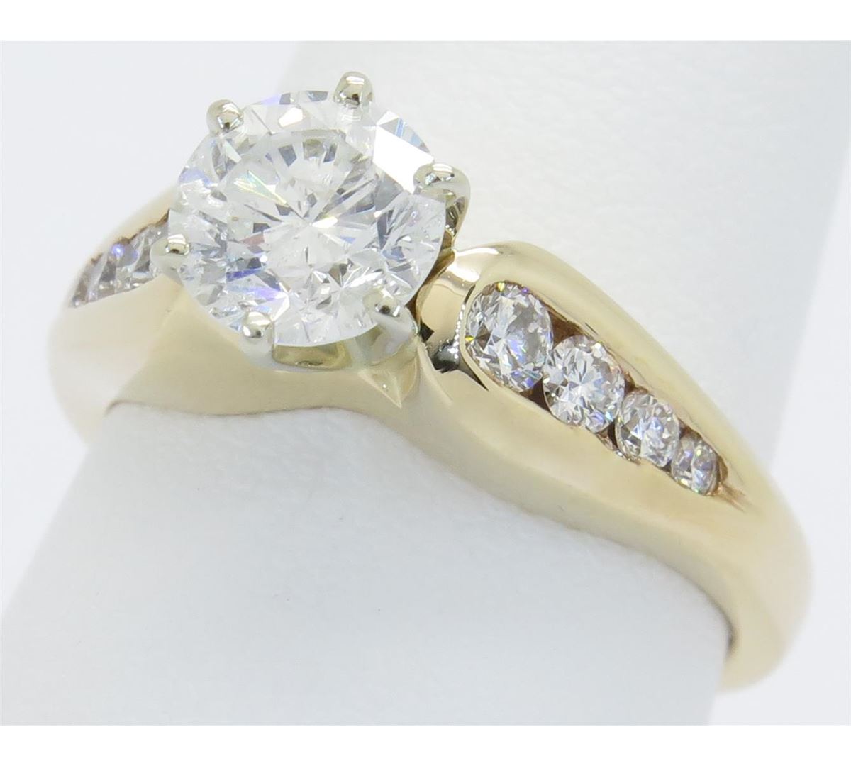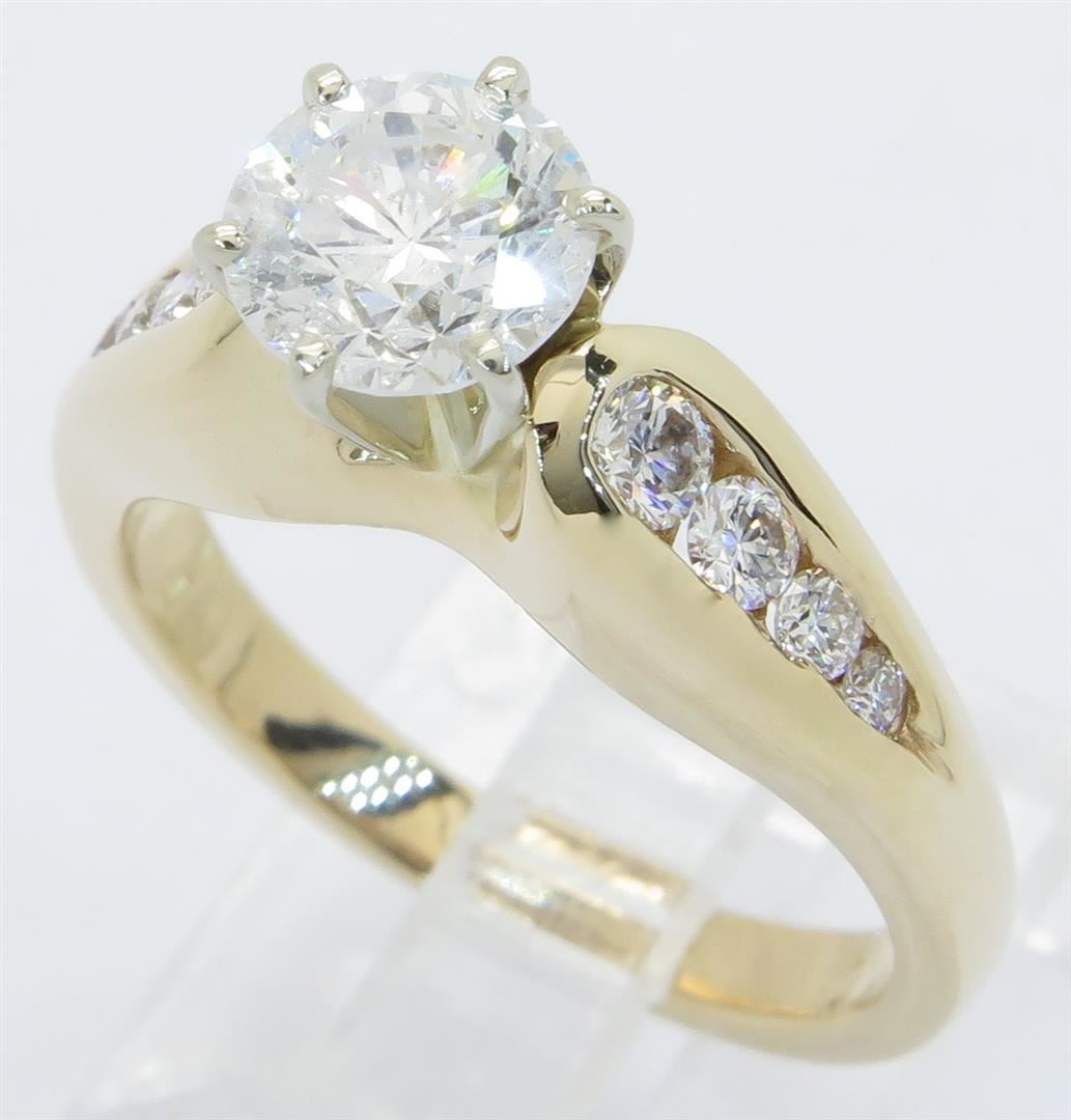 One tested 14K yellow gold diamond ring. Containing: One Round Brilliant Cut Diamond. Approximate Size: 1.06CT, Clarity: I, Color: G-H. 8 Round Brilliant Cut Diamonds. Approximate total diamond weight: 1.41CTW. Diamonds are graded in the mounting, unless otherwise stated. Weight of ring: 5.5 grams. Size: 5.75.