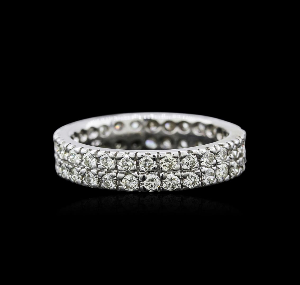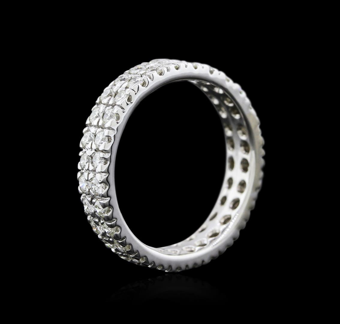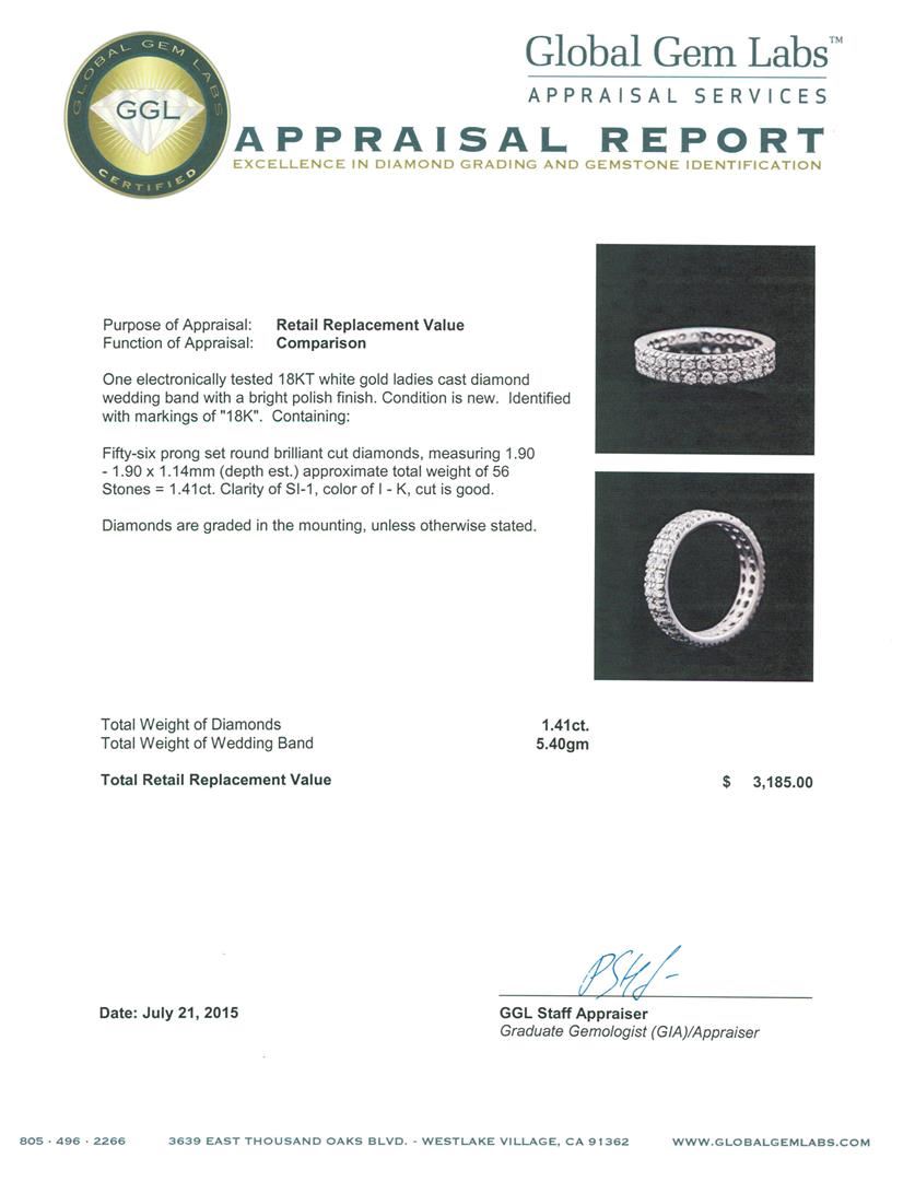 One electronically tested 18KT white gold ladies cast diamond wedding band with a bright polish finish. Identified with markings of "18K". Condition is new. Containing: Fifty-Six prong set round brilliant cut diamonds, measuring 1.90 - 1.90 x 1.14mm (depth est.) approximate total weight of 56 Stones = 1.41ct. Clarity: SI-1. Color: I - K, Cut is Good. Diamonds are graded in the mounting, unless otherwise stated. Total Weight of Diamonds 1.41ct. Total Weight of Wedding Band 5.40gm. GGL Appraised at $3,185.00.