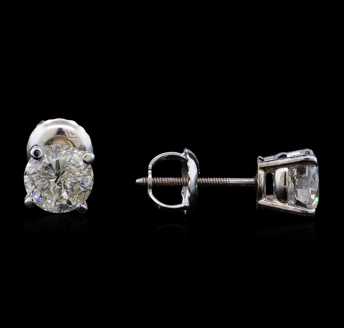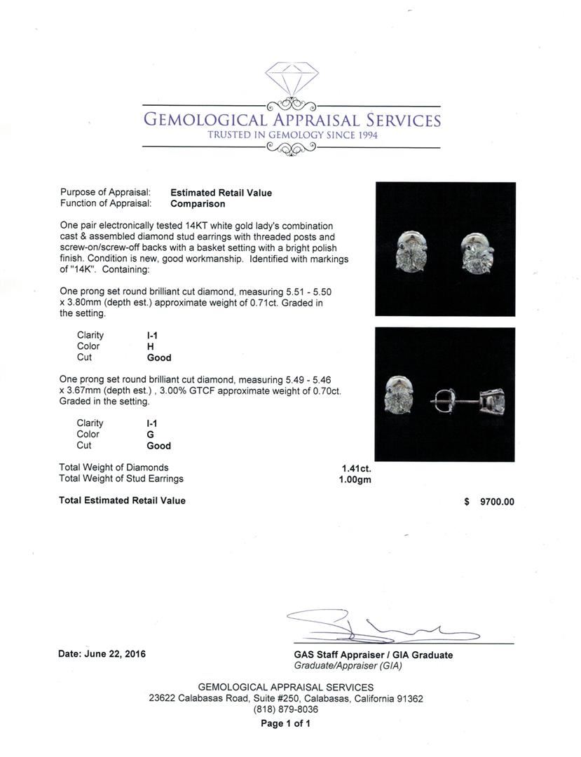 One pair electronically tested 14KT white gold lady's combination cast & assembled diamond stud earrings with threaded posts and screw-on/screw-off backs with a basket setting with a bright polish finish. Identified with markings of "14K". Condition is new, good workmanship. Containing: One prong set round brilliant cut diamond, measuring 5.51 - 5.50 x 3.80mm (depth est.) approximate weight of 0.71ct. Graded in the setting. Clarity: I-1. Color: Good One prong set round brilliant cut diamond, measuring 5.49 - 5.46 x 3.67mm (depth est.) , 3.00.%. GTCF approximate weight of 0.70ct. Graded in the setting. Clarity: I-1. Color: Good. Total Weight of Diamonds 1.41ct. Total Weight of Stud Earrings 1.00gm. GAS Appraised at $9,700.00.