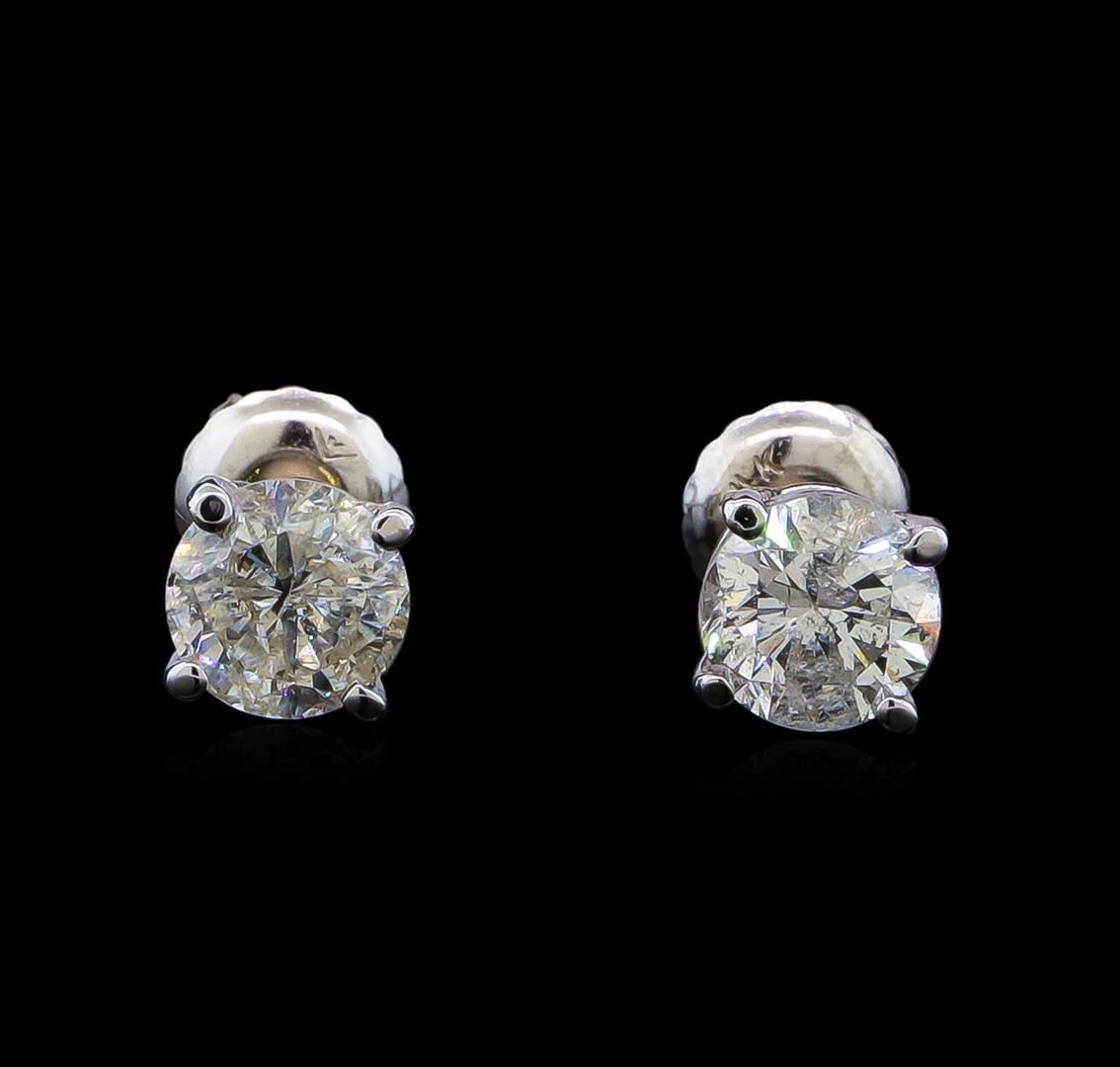 One pair electronically tested 14KT white gold lady's combination cast & assembled diamond stud earrings with threaded posts and screw-on/screw-off backs with a basket setting with a bright polish finish. Identified with markings of "14K". Condition is new, good workmanship. Containing: One prong set round brilliant cut diamond, measuring 5.51 - 5.50 x 3.80mm (depth est.) approximate weight of 0.71ct. Graded in the setting. Clarity: I-1. Color: Good One prong set round brilliant cut diamond, measuring 5.49 - 5.46 x 3.67mm (depth est.) , 3.00.%. GTCF approximate weight of 0.70ct. Graded in the setting. Clarity: I-1. Color: Good. Total Weight of Diamonds 1.41ct. Total Weight of Stud Earrings 1.00gm. GAS Appraised at $9,700.00.
