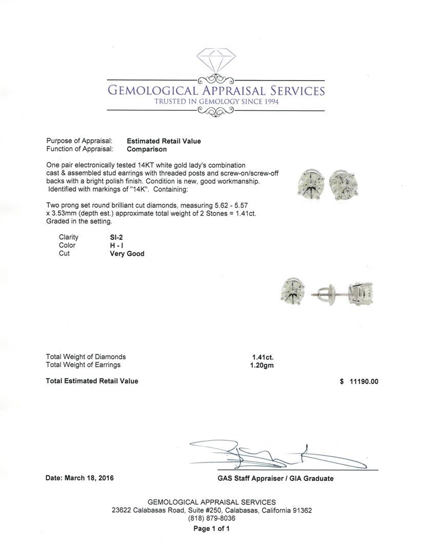 One pair electronically tested 14KT white gold lady's combination cast & assembled stud earrings with threaded posts and screw-on/screw-off backs with a bright polish finish. Identified with markings of "14K". Condition is new, good workmanship. Containing: Two prong set round brilliant cut diamonds, measuring 5.62 - 5.57 x 3.53mm (depth est.) approximate total weight of 2 Stones = 1.41ct. Graded in the setting. Clarity: SI-2. Color: H - I. Cut Very Good. Total Weight of Diamonds 1.41ct. Total Weight of Earrings 1.20gm. GAS Appraised at $11,190.00.