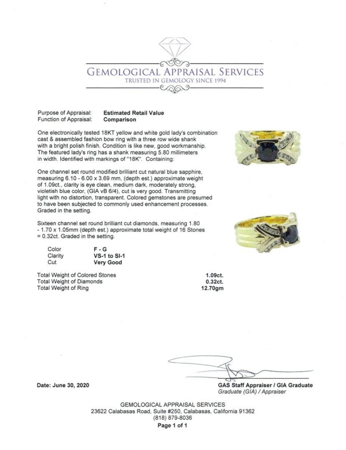 One electronically tested 18KT yellow and white gold lady's combination cast & assembled fashion bow ring with a three row wide shank with a bright polish finish. The featured lady's ring has a shank measuring 5.80 millimeters in width. Identified with ma